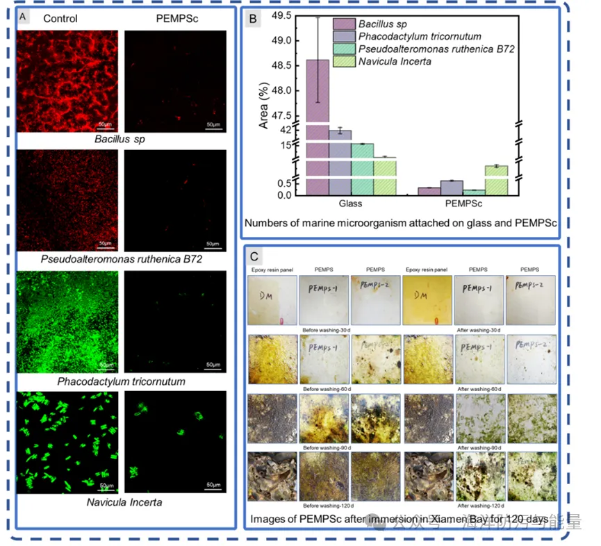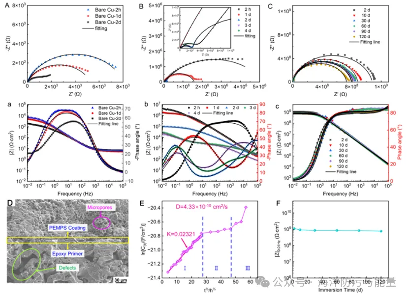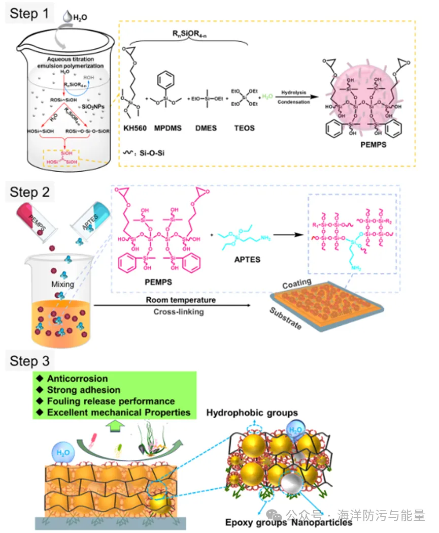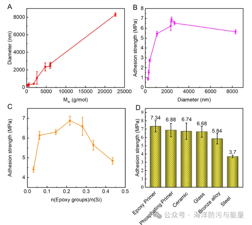 涂层的制备: 将MPDMS(0.07mol,12.74g)、DMES(0.03 mol,4.44g)、KH560(0.04mol,9.44g)和TEOS(0.0446 mol, 7.94 g)在三颈烧瓶(250 mL)中混合。随后,将SiO2NPs(2.6g)和四 甲基氢氧化铵(0.1mL)共同添加到烧瓶中后,在连续搅拌下逐滴添加去离子水(90mL)。逐渐升温至80°C,搅拌24h,再升温至135°C,搅拌4h,使催化剂热解,蒸馏除去体系中的水。最后,将反应冷却至室温,得到透明粘稠液体,命名为PEMPS。 PEMPS和APTES的细致缩合反应配制而成的聚硅氧烷涂层被命名为PEMPSc。在典型的制备中,PEMPS (10.0g)和 APTES (2.5g)溶解在丁醇中,并使用磁力搅拌器充分混合15分钟。随后,通过喷涂将PEMPSc涂层涂覆到各种基材上。然后使涂覆的基材在室温下固化2小时,从而形成纳米复合材料涂层。 方案1. 步骤1)合成环氧聚硅氧烷纳米胶束的示意图,步骤2)交联过程的示意图,步骤3)PEMPSc的多功能 PEMPS的表征: PEMPS是通过水滴定乳液聚合技术合成的,其化学成分通过图1和2所示的1H NMR和FTIR分析进行了验证。分别如图1A和1B所示。1H NMR 谱(图1A)在 0.014ppm (a) 和 0.31ppm (c) 处显示出明显的峰,表明 Si‐Me 基团内存在‐CH3部分。此外,0.087ppm(b)、1.62–1.42ppm(d)、2.05 ppm(e)、3.67ppm (f) 和4.7ppm (g)处的峰对应于环氧丙基中的‐CH2‐和‐CH‐片段,而7.44–7.41 ppm (h)和 7.64 ppm 处的峰对应(i)归因于苯基。PEMPS的FTIR光谱(图1B)以及KH560、MPDMS、DMES和TEOS的FTIR光谱显示了几个特征峰,进一步验证了其成功合成。3070至3800cm-1之间的宽峰带表示PEMPS中存在的‐OH、C‐O‐C‐和环氧基团的伸缩振动。830cm-1处的弱峰对应于环氧基团的弯曲振动。此外,2960、2870和1380cm-1处的峰代表Si‐Me键的伸缩振动,而2930、2850和1465cm-1 处的峰则与‐CH2‐基团相关。PEMPS的Si‐Ph伸缩峰在3070、1600和 1500cm-1处很明显。C‐O‐C对称拉伸峰出现在1103cm-1处,跨越1000‐1100cm-1的宽峰带表明PEMPS中的Si‐O‐Si弯曲峰。这些光谱特征证实了PEMPS的成功合成。 图1.A)PEMPS的1H核磁共振 B)PEMPS的红外透射光谱 附着力测试: 图2阐明了分子量与其对PEMPS颗粒尺寸以及涂层附着力的影响之间复杂的相互作用。当分子量(Mw)在约300至6000g/mol范围内时,附着力表现出正比关系,PEMPS对环氧底漆的附着强度0.87±0.13MPa上升至7.34±0.18MPa,比PDMS提高了十倍。然而,观察到了一个阈值,超过该阈值,过高的分子量会略微降低粘附力。与此同时,分子量的增加不可避免地导致聚硅氧烷胶束粒径的增大,如图2B所示;粒径对涂层的影响如图1A所示。 聚硅氧烷具有最高的分子量,并形成初始的高强度网络,分子量似乎可以根据粘合‐内聚平衡显示最佳位置。低于Mw ≈ 5996g/mol,没有足够的内聚力来产生最强的粘附力。当超过Mw≈6060g/mol时,内聚力的增加是以表面粘合相互作用为代价的。图2C揭示了环氧基含量与聚硅氧烷涂层附着力之间的抛物线关系,在环氧基含量为0.23(M/M)时峰值为6.88MPa。粘合强度的增强可能归因于环氧基团和极性基材之间氢键的形成。随着环氧基团数量的增加,PEMPS的扩散能力逐渐减弱,导致粘合强度和内聚力均失效。 图2D进一步强调了PEMPS在不同基材上的卓越粘合强度,包括环氧底漆(~7.34MPa)、磷化底漆(~6.88MPa)、陶瓷(~6.74MPa)、玻璃 (~6.68MPa)、青铜合金(~5.84MPa)和钢(~3.7MPa)。除了氢键外,涂层不仅可能通过PEMPSc的环氧基团与环氧底漆、磷化底漆、 陶瓷或玻璃上的羟基之间的反应以共价键结合到基材上,而且还增强了与基材的相互渗透,产生机械互锁结构,进一步增强了附着强度。对于青铜合金,由于Cu和环氧基团之间形成配位键,结合强度进一步提高。该涂层对钢的附着强度较低(~3.7MPa),因为PEMPSc和钢表面之间仅存在氢键。 图2.(A)PEMPS重量平均分子量与粒径的关系,PEMPS(B)和环氧基团(C)中粒径对涂层附着强度的影响,(D)PEMPSc在各种表面上的附着力表现 PEMPS既含有疏水基团(Si‐Me)又含有亲水基团(环氧基)。图3表示Si‐Me基团的比例增加,由于疏水元素的增加,表面能减小,但环氧基团产生了抵消影响,如图3B所示。通过巧妙地平衡这两个官能团的含量,聚硅氧烷涂层在强附着力和疏水性方面均表现出色。图3C显示PEMPSc上液滴的动态行为,水滴很容易从倾斜的涂层上滑落,表明涂层具有优异的防水性能。 图 3. PEMPSc 的 WCA、DCA 和表面能 (A,B),以及 PEMPSc 的防水性 (C) 不同SiO2NPs含量的样品拉伸性能的变化如图4A所示。与不含SiO2NPs的样品相比,复合PEMPSc涂层(SiO2NPs改性)的模量降低,而断裂伸长率和断裂强度增加。这表明SiO2NPs填充了微孔和缺陷,降低了涂层的内应力,从而提高了其韧性。当SiO2NPs含量增加到7.5 wt%时,样品的这些性能达到最佳状态。这可以归因于随着SiO2NPs含量的增加交联密度发生变化。纯的PEMPS和用SiO2NPsPEMPSc改性的储能模量如图4B所示。PEMPSc的玻璃化转变区域 (Tg) 发生在5和1.3°C之间 (图4C)。PEMPSc的储能模量随着SiO2NPs的加入而降低。这是因为聚硅氧烷分子之间的相互作用并未受到SiO2NPs掺入的影响,保持了分子链的活性,因此PEMPSc的Tg没有发生显着的改变。图4(D‐F)说明了不同相对分子量及其分布对涂层机械性能的影响。具体来说,当SiO2NPs含量为7.5wt%时,随着PEMPS分子量 (Mw) 的增加,观察到涂层的韧性、储能模量和Tg显着增强。这种现象源于PEMPS的Mw与其分子链之间的缠结密度之间的正比关系。 图 4. 聚硅氧烷涂层的动态力学分析:A‐C:SiO2NPs 含量的影响 D‐F:相对分子量及其分布的影响 图5封装了裸青铜、环氧底漆涂层青铜和PEMPSc/环