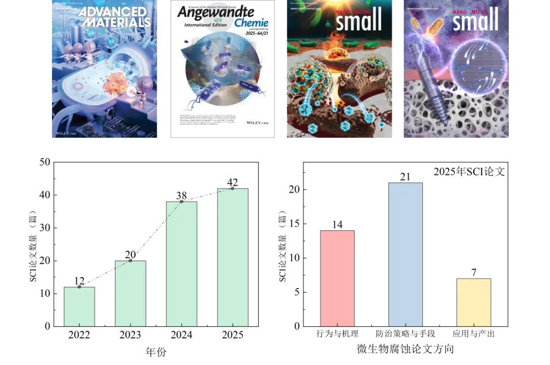 2025 年终工作总结报告 2025 东北大学腐蚀与防护中心微生物腐蚀与生物污损课题组是依托于王福会教授团队,由Derek Lovley教授领衔、徐大可教授负责,聚焦交叉学科建设,致力于服务国家重大战略需求,落实“四个面向”部署,是一支以服务国家经济与国防主战场为导向、瞄准世界科技前沿的科研团队。 团队拥有国家杰出青年科学基金获得者2人(王福会、徐大可)、国家级青年人才2人(张明星、周恩泽);中国博士后创新人才支持计划入选者2人(李祥宇、于智群)、中国科协资助青年托举人才1人(周恩泽)、博士后海外引才专项入选者1人(崔苗苗);辽宁省兴辽英才青年拔尖人才1人(范永强)、辽宁省青年科学基金B类2人(李中、李祥宇),形成了一支年轻(平均年龄34岁)、国际化(50%海外学历或访学和博后经历)、富有战斗力的高水平队伍,引领了国内和国际微生物腐蚀领域的发展。 “技”往开来,“微”来可期。 岁月不居,2025年在辛勤耕耘与团结协作中悄然走过。面对机遇与挑战并存的一年,东北大学微生物腐蚀与生物污损课题组始终秉持协同攻关的理念,持续推进科学创新与探索。 2025年课题组标志性成果如下: ① 周恩泽研究员入选国家级青年人才(建议人选); ② 李祥宇研究员荣获中国腐蚀与防护学会科学技术一等奖(拟授奖); ③ 李佳航同学获得东北大学材料科学与工程学院第一个国家自然科学基金青年学生基础研究项目(博士研究生); ④ 在 Advanced Materials,Angewandte Chemie International Edition,Advanced Functional Materials和Journal of Materials Science & Technology 等国际知名期刊发表论文17篇。 让我们共同回望这一年的足迹,凝练研究亮点,分享阶段性成果,并在此基础上展望未来,为课题组的持续发展勾勒更加清晰的蓝图。 获奖与课题立项 2025年,课题组聚焦微生物腐蚀与生物污损关键科学问题与工程需求,持续夯实研究基础、拓展应用场景,获得22个项目/基金支持,总经费超770万元,为前沿基础研究、人才梯队建设与学生创新能力提升赋能,不断注入活力。 获奖 李祥宇(1/11),于滨(3/11) 于智群(5/11),贺文岫(6/11) 荣获 中国腐蚀与防护学会科学技术奖 自然科学奖 一等奖 (拟授奖) 王迪(5/8) 荣获 中国腐蚀与防护学会科学技术奖 自然科学奖 一等奖 (拟授奖) 徐大可(5/8) 荣获 中国腐蚀与防护学会科学技术奖 科技进步奖 一等奖(拟授奖) 前沿基础研究 课题组以国家重大需求服役场景为牵引,系统推进机理研究,为后续防护策略与工程应用提供坚实理论支撑。2025年,在前沿基础研究方面,课题组获得国家重点研发项目课题1项,国家自然科学基金面上项目2项,青年科学基金项目(C类)1项,国自然基金委博士生项目1项,辽宁省青年科学基金B类项目1项,广东省联合基金项目1项,东北大学GF重大培育项目1项,辽宁省自然科学基金项目(博士启动项目)2项,中国博士后面上资助项目1项,校企合作项目1项,校级教改项目1项,东北大学博士生科研创新项目3项。 张明星 主持 国家重点研发项目课题 深海污损/腐蚀生物数据库 与污损/腐蚀机制研究 周恩泽 主持 国家自然科学基金面上项目 李祥宇 主持 ①国家自然科学基金面上项目 ②东北大学GF重大培育项目 李中 主持 ①广东省基础与应用基础 研究基金-海上风电联合基金项目 ②辽宁省青年科学基金(B)类项目 李嘉琦 主持 ①青年科学基金项目(C类) ②辽宁省自然科学基金项目 (博士启动项目) ③第78批中国博士后面上资助项目 王迪 主持 ①校企合作油田项目 ②校级教改项目 人才梯队建设 在科研任务稳步推进的同时,课题组进一步强化人才梯队布局,依托博士后、青年骨干及省部级人才类资助,持续完善团队结构。2025年,在人才梯队建设方面,课题组新增国家级青年人才1人,博士后海外引才专项计划1人次,中国博士后创新人才支持计划1人次,国家资助博士后研究人员计划1人次。 周恩泽 入选 国家级青年人才(建议人选) 崔苗苗 入选 博士后海外引才专项计划 于智群 入选 2025年度中国博士后 创新人才支持计划 刘赫 入选 国家资助博士后研究人员计划 (C档) 学生创新能力提升 课题组以各类博士生专项与创新计划为抓手,鼓励学生围绕前沿问题开展独立探索与交叉研究,推动学生在科研素养、创新意识与学术产出方面实现稳步提升。 李佳航同学获得东北大学材料科学与工程学院第一个国家自然科学基金青年学生基础研究项目(博士研究生),李佳航和杨琳琳同学入选中国科协青年科技人才培育工程博士生专项计划,标志着课题组人才培养进入高质量发展的新阶段。 李佳航 入选 中国科协青年科技人才 培育工程博士生专项计划 杨琳琳 入选 中国科协青年科技人才 培育工程博士生专项计划 李佳航 (导师:徐大可教授,周恩泽研究员) 主持 国自然基金委博士生项目 深海硫酸盐还原菌作用下 钛合金的氢脆机制研究 欧阳玺 (导师:徐大可教授,张明星教授) 主持 东北大学博士生科研创新项目 机器学习驱动的耐微生物腐蚀 AlTiCu-CoCrFeNi系高熵合金设计与制备 张馨 (导师:张明星教授,于滨副教授) 主持 东北大学博士生科研创新项目 基于H2O2自生成和NO释放开关的 级联催化防污剂的构建及性能研究 吴佩瑜 (导师:崔苗苗研究员) 主持 东北大学博士生科研创新项目 柔性单片式液滴纳米摩擦发电机的 激光增材制造与多场景应用集成 课题组荣誉与奖项 课题组在持续推进科学研究的