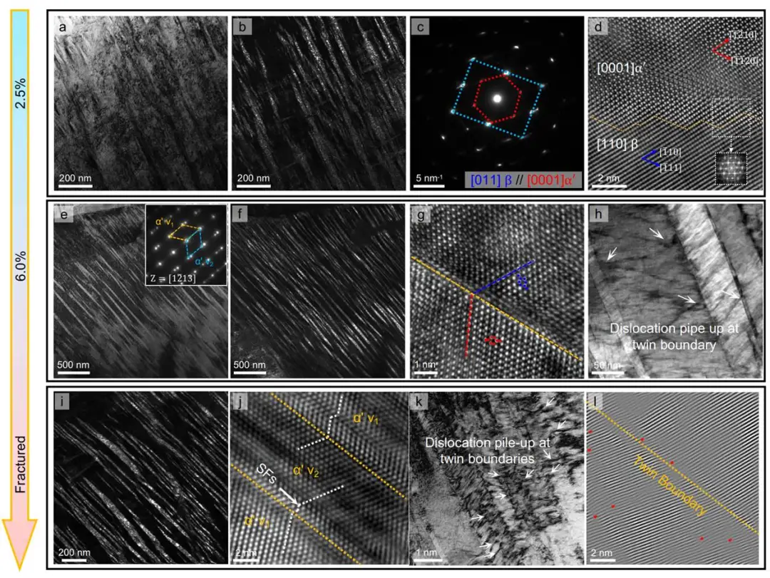 图 6. 变形机制的TEM 分析。(a–b) 应变 2.5% 时的明场与暗场 TEM 图像。(c) 图(a) 对应的选区电子衍射(SAED)花样。(d) 显示 α′/β共格界面的高分辨 TEM(HRTEM)图像(插图为 FFT 图像)。(e) 应变 6.0% 时的明场TEM 图像,插图 SAED 花样表明 α′变体(v1与 v2)之间存在互孪晶关系。(f) 低倍暗场 TEM 图像及插入的高分辨 TEM 图像。(g) 显示孪晶界的高分辨TEM 图像。(h) 孪晶界处的位错分布。(i–j) 断裂后的暗场与高分辨 TEM 图像。(k–l) 孪晶界处的位错累积情况。