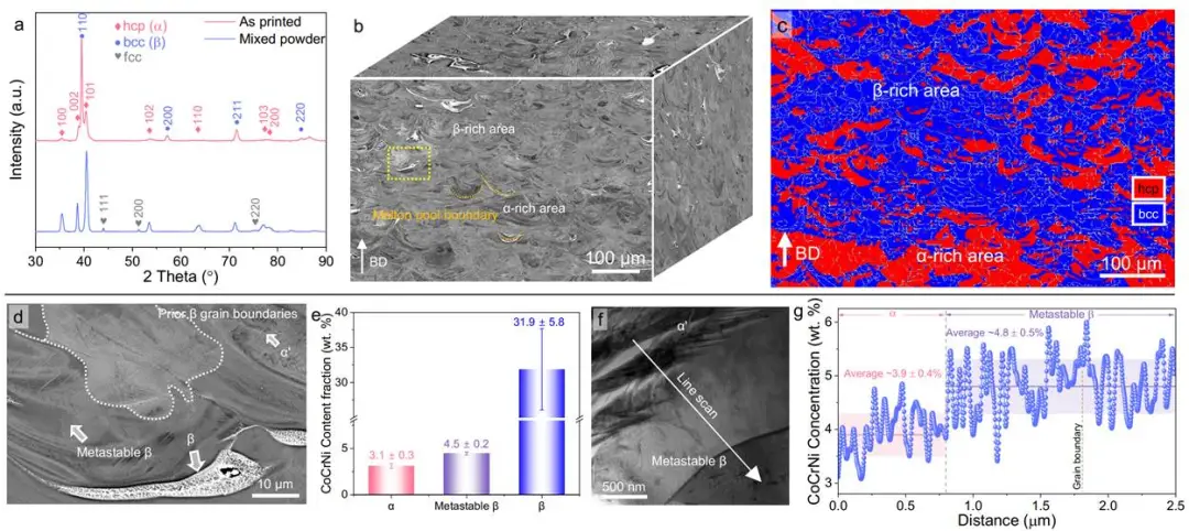 图 3. 打印态(as-printed)Ti-6Al-4V + 5% CoCrNi 合金的显微组织。(a) 混合粉末与成形态样品的 XRD 图谱。(b) 沿扫描方向(SD)和成形方向(BD)的三维背散射电子(BSE)图像。(c) 沿 BD 方向的电子背散射衍射(EBSD)相分布及原始 β 晶界映射。(d) (b) 中标示区域的高倍 BSE 图像。(e) 不同区域中的CoCrNi 含量统计,至少选取五个位置并给出标准偏差。(f)亚稳 β 相的形貌及其化学成分的线扫描结果(g)。