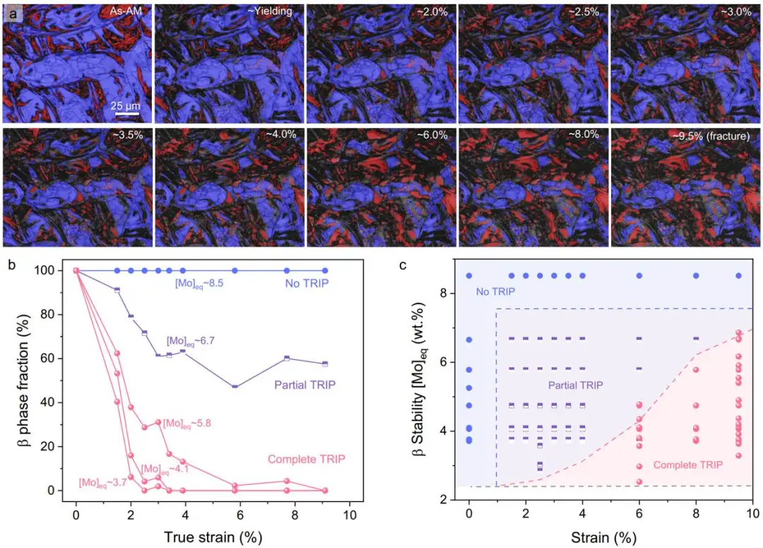 图 5. 不同拉伸应变下的准原位EBSD结果。(a) 不同工程应变下典型富 β 区域的相分布图(叠加带衬度)。蓝色区域对应 bcc 相,红色区域对应 hcp 相。(b) 不同[Mo]eq相稳定性条件下局部区域中的β 相体积分数。(c) 基于 β 相稳定性 [Mo]eq与变形应变的 TRIP 行为总结,统计结果来自不同应变条件下 EBSD 与 TEM 表征的三十余个局部区域(典型TEM 结果见图 S20)。不同 TRIP 区域之间的分界线根据屈服应变(左边界)、最小测得的 [Mo]eq(下边界)以及重叠区域的关键中点(上边界与对角边界)进行近似绘制。