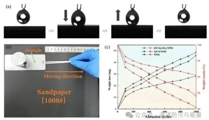 图 4(a) 呈现了涂层优异的超疏水特性,其水接触角显著超过160°且滚动角小于5°,液滴在表面表现出完全不粘附的 Cassie-Baxter 状态。这种超疏水性源于ZIF-8骨架与SiO₂纳米粒子构建的微纳双尺度粗糙结构以及低表面能(约20.3mJ/m²)的协同效应,该表面能数值恰好处于 Baier 曲线定义的最低生物污损附着范围内,有助于实现被动防污。为了评估涂层的机械稳定性,图4(b)展示了使用 1000 目砂纸进行磨损实验的装置,图4(c)则量化记录了 NPDI、ZIF-8/NPDI 及 ZIF-8@SiO₂/NPDI 三种样品在经受 1000 次磨损后的重量损失情况。结果显示,ZIF-8@SiO₂/NPDI 涂层的重量损失低于 30mg(失重率 <10%),表现出极低的磨损率。这种出色的耐磨性归因于 ZIF-8/SiO₂ 形成的硬度梯度结构以及 Si-O-Zn 强界面结合,能够有效耗散机械应力并抑制裂纹扩展,证明了该涂层在海洋防护应用中的巨大潜力。