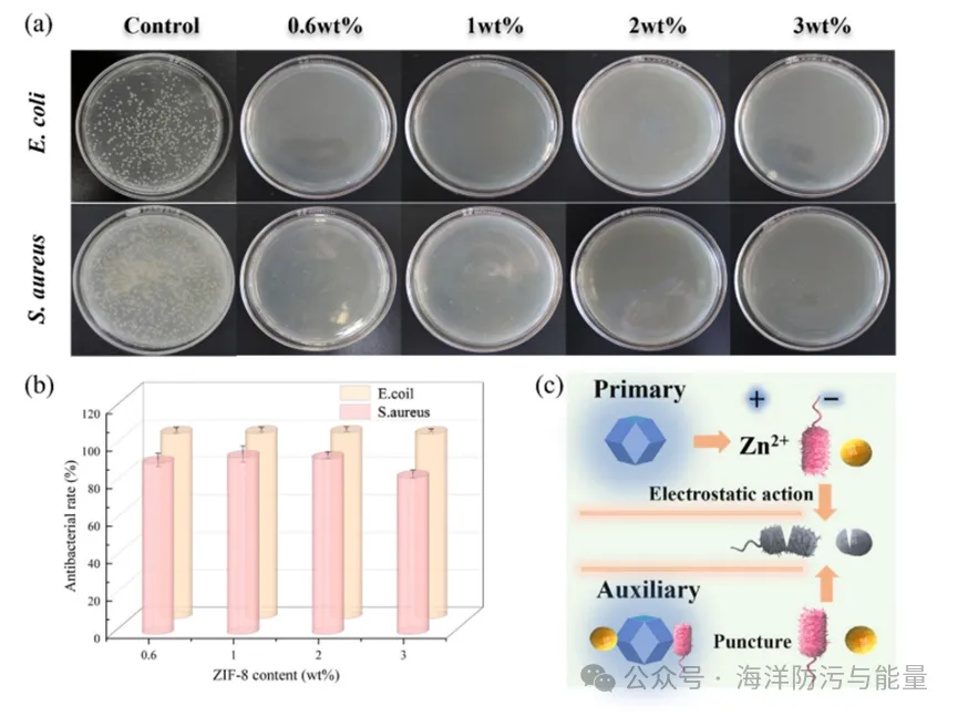 图9.(A)对照组和ZIF-8@SiO2/NPDI涂层钢板在大肠杆菌和金黄色葡萄球菌悬液中浸泡24小时后的菌落培养图像;(B)对照组和ZIF-8@SiO2/NPDI涂层钢板的抑菌率;(C)ZIF-8的抑菌机理。