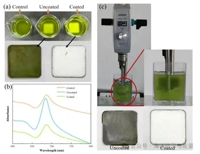 图10.(A)小球藻溶液与钢板浸泡后的表面;(B)小球藻浸泡3天后的紫外可见光谱;(C)动态防藻实验装置与钢板表面的小球藻粘附性。