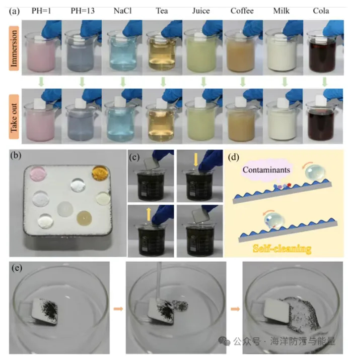 图5.(A)ZIF-8@SiO2/NPDI涂层在酸、碱、盐、茶、果汁、咖啡、牛奶和可乐液体中的浸泡和去除图;(B)八种液体污染物在ZIF-8@SiO2/NPDI涂层上的图像;(C)ZIF-8@SiO2/NPDI涂层在含有颗粒污染物的液体中的浸泡和去除示意图;(D)ZIF-8@SiO2/NPDI涂层的自洁示意图;(E)ZIF-8@SiO2/NPDI涂层的自洁实验示意图。