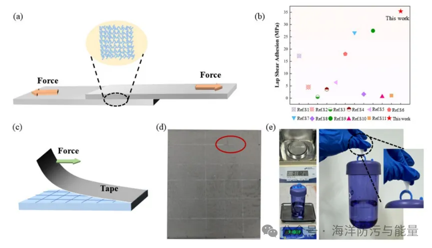图7.(A)搭接剪切实验示意图;(B)涂层搭接承受的剪切力的比较;(C)剥带实验示意图;(D)剥带后涂层的形态;(E)ZIF-8@SiO2/NPDI材料的承载能力。