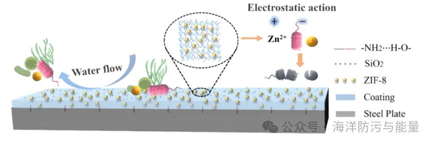 图11系统概括并展示了该新型涂层实现长期海洋防污的“被动保护-主动杀菌-机械保护”三重协同机理。在被动保护方面,该图描绘了涂层表面的乳突微结构如何产生“气垫效应”以减少生物接触,并利用超疏水特性带来的低界面结合力实现水流剪切下的自清洁;在主动杀菌方面,展示了ZIF-8释放的Zn²⁺阳离子如何靶向吸附并破坏带负电的细菌结构,从而从源头抑制生物膜的形成;在机械保护方面,图示揭示了珍珠仿生“砖-泥”结构中氢键与共价键的络合作用,阐明了涂层如何通过内部氢键的可逆断裂与重组来吸收能量和分散应力,从而在复杂的海洋环境中维持卓越的结构完整性。