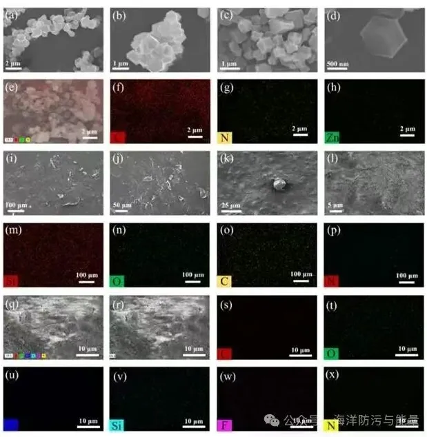 图2.(A)-(D)ZIF-8形貌结构和尺寸的扫描电子显微镜图像;(E)-(H)ZIF-8的EDS图像;(I)-(L)不同尺度下ZIF-8@SiO2/NPDI涂层微观结构表面的扫描电子显微镜图像;(M)-(P)NPDI的EDS图像;(Q)-(X)ZIF-8@SiO2/NPDI的EDS图像。