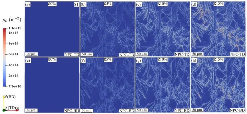 图5. GND密度的各向异性分布(a-d)在TD方向加载时,S1的NPC模型在0%、5%、10%和15%的名义应变下,单轴拉伸的GND空间分布。(e-h)BD加载的相应数据。这揭示了GND随晶界浓度的积累和局域化程度的增加。