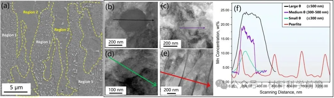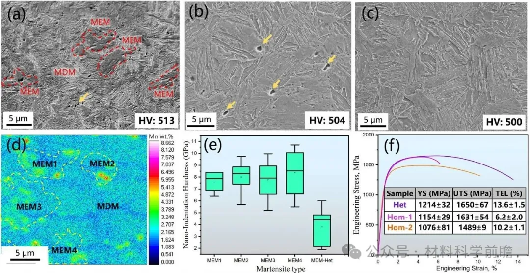 马氏体钢通常具有高的屈服强度和抗拉强度,但其塑性一般较差,难以满足工业界对高强高韧的要求。目前通常采用热处理等方法提升塑性,如淬火配分(Q&P)工艺可稳定残余奥氏体,奥氏体的相变诱导塑性(TRIP)效应可改善材料的性能。然而,这些方法通常需要复杂的工序和严格的温度控制,使得大规模工业化应用变得复杂。 近日,清华大学陈浩教授、天津大学丁然副教授和清华大学/鞍钢海洋装备用金属材料及其应用国家重点实验室张游游博士(通讯作者),在期刊Scripta Materialia上发表了题为“Ductilizing martensite in lean steel via chemical heterogeneity”的文章。研究人员采用闪速退火策略在低锰钢中构建了具有化学异质结构的马氏体,同时引入组织的异质性,显著提升了材料的强塑性协同。本研究阐明了Mn元素的变化对原奥氏体晶粒内马氏体变体选择的影响,从而在马氏体为主的基体中实现了强度不降而塑性提升的优异性能。和之前的研究不同,本工作在无奥氏体TRIP效应存在的情况下,主要依靠马氏体自身的组织和化学异质结构获得了高强高韧的性能组合。 本研究用低锰钢的化学成分为Fe-0.19C-1.5Si-2.0Mn-0.02Nb wt.%,热轧板经卷取、冷轧后进行3种不同的热处理。Het样品热处理为:300℃/s闪速加热到920℃保温2s,随后以300℃/s冷却至室温,实现完全奥氏体化且保留化学异质结构;Hom-1样品热处理为:920℃保温30s,加热和冷却速度和Het样品相同;Hom-2样品热处理为:920℃保温20min,水淬到室温,然后进行和Het样品相同的闪速退火热处理。所有样品在拉伸前进行170℃/20min的回火处理,模拟汽车行业的喷涂烘烤工艺。初始组织中,珠光体片层和渗碳体颗粒中存在Mn元素富集,铁素体中Mn元素浓度较低(~1.3 wt.%),如图1所示。 图1 原始组织:Region1珠光体区域和Region2弥散分布渗碳体颗粒的铁素体区域 3个样品表现出不同的微观组织,如图2(a-c)。其中,Het-1样品中存在两种不同类型的马氏体,MDM-贫Mn马氏体和MEM-富Mn马氏体。尽管3个样品的显微维氏硬度相当(~500HV),但是Het样品中的MDM和MEM区域存在明显的硬度差别,如图2(e)。硬度的差别主要是由于MEM区域富C富Mn,这对样品的力学性能也产生较大的影响。如图2(f)所示,Het样品展现出更高的强度,同时更高的塑性。 图2 SEM微观组织:(a)Het, (b)Hom-1, (c)Hom-2;(d)EPMA分析Het样品纳米压痕区域Mn浓度;(e)MEM和MDM区域纳米压痕结果;(f)3个样品的工程应力应变曲线 MDM区域表现出多个Bain group,每个group包含多个马氏体变体;而MEM区域只存在一个Bain group和单个马氏体变体,表明Mn元素不均匀性会影响马氏体的相变路径,如图3(a-d)。在快速冷却过程中,贫Mn区域先发生马氏体相变,应变会在周围的富Mn区域累积,导致富Mn区域形成马氏体单变体。相变过程中,MEM和MDM区域不同的马氏体相变行为会在两者界面处形成几何必须位错(GNDs),以缓解晶格畸变(图3(e))。 图3 (a)Het样品的SEM图像;(b-d)包含MEM和MDM马氏体的原奥晶界、Bain和变体构型;(e)MEM和MDM区域的HAADF TEM图像 MDM(3.5GPa)和MEM(4.8GPa)区域显著的硬度差别导致在变形过程中存在应变配分以及界面处GNDs的产生,如图4(a, b)。GNDs的累积在MDM和MEM界面处造成了强烈的背应力(如图4(c1, c2)),通过异质变形诱导硬化推迟了颈缩的产生,最终使得Het样品具有更高的强度和更优的延伸率。 图4 (a)DIC表征Het样品拉伸过程中的应变配分;(b) KAM图像表征Het样品拉伸过程中的GNDs演变;Het样品和Hom-1样品的(c1)加载-卸载-再加载曲线和(c2)背应力随应变的演变 综上,本研究通过对初始组织为铁素体+珠光体的冷轧钢进行闪速加热和冷却,获得了不同Mn含量的马氏体。Mn的不均匀性导致马氏体内部存在明显的变体选择和硬度差异,从而增强了GNDs介导的背应力。因此,Het样品在不依赖TRIP效应的情况下,强度和塑性同时得到提升,其综合性能优于均质马氏体样品。本研究表明,马氏体中固有的化学诱导结构异质性可实现卓越的强塑性协同效应,为先进高强度钢提供了一种简单高效的替代方案。