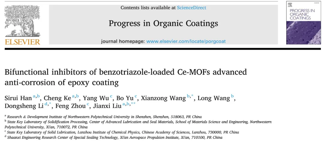 近期,西北工业大学刘建喜/王显宗团队、西安航天动力研究所李东升团队通过将无机和有机缓蚀剂协同结合,成功制备了一种具有长期防腐性能的复合环氧涂层。