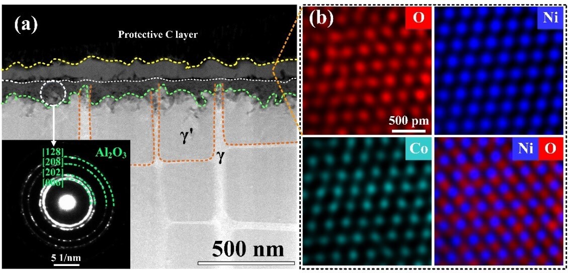 研究背景:镍基单晶高温合金是制造先进航空发动机涡轮叶片的核心材料,其优异的高温强度和抗氧化性能直接决定了发动机的效率和寿命。在极端高温和氧化环境中,镍基单晶高温合金表面会自发形成结构复杂的多层氧化物,这些氧化物层的演化和结构稳定性可以决定合金的抗氧化性能和工作寿命。然而,揭示和理清这些氧化物层复杂结构的形成过程,尤其是其早期动态演化过程,一直是个该领域研究的难题,一个主要原因是进行原位或准原位跟踪观测表征需要在时空尺度进行精细取样。海南大学先进的皮米电镜中心设施为解决该难题提供了可能。