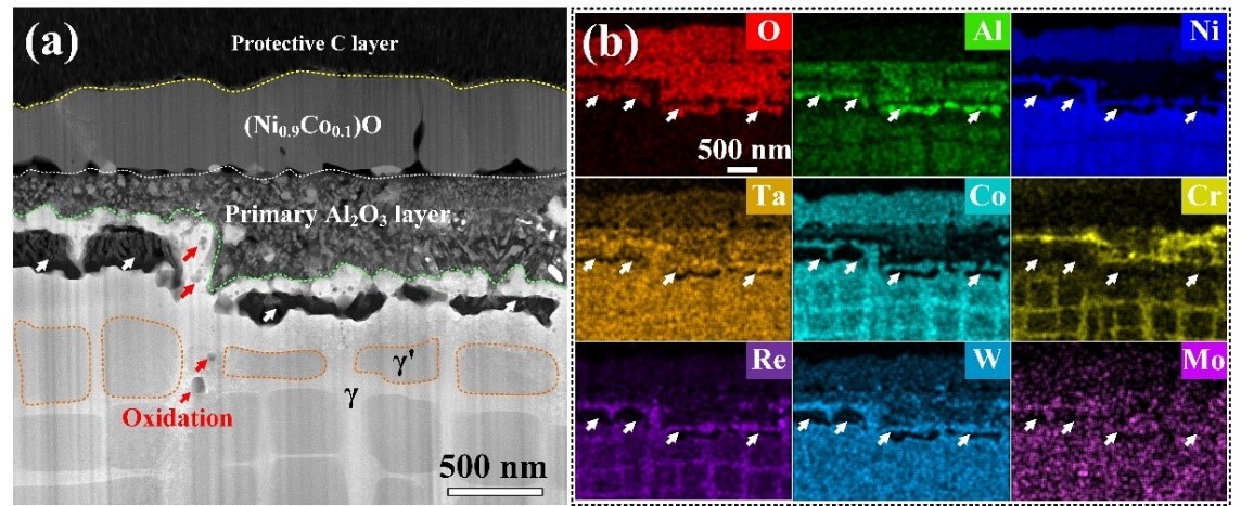 多尺度表征结果显示(图1),最终形成的氧化层结构是5个亚层氧化物结构,并非文献中普遍认为的3个亚层氧化物结构,空间分布上由表至深分别是:(Ni0.9Co0.1)O第1层、NiAl2O4第2层、CoCr2O4第3层、CrTaO4第4层和Al2O3第5层。