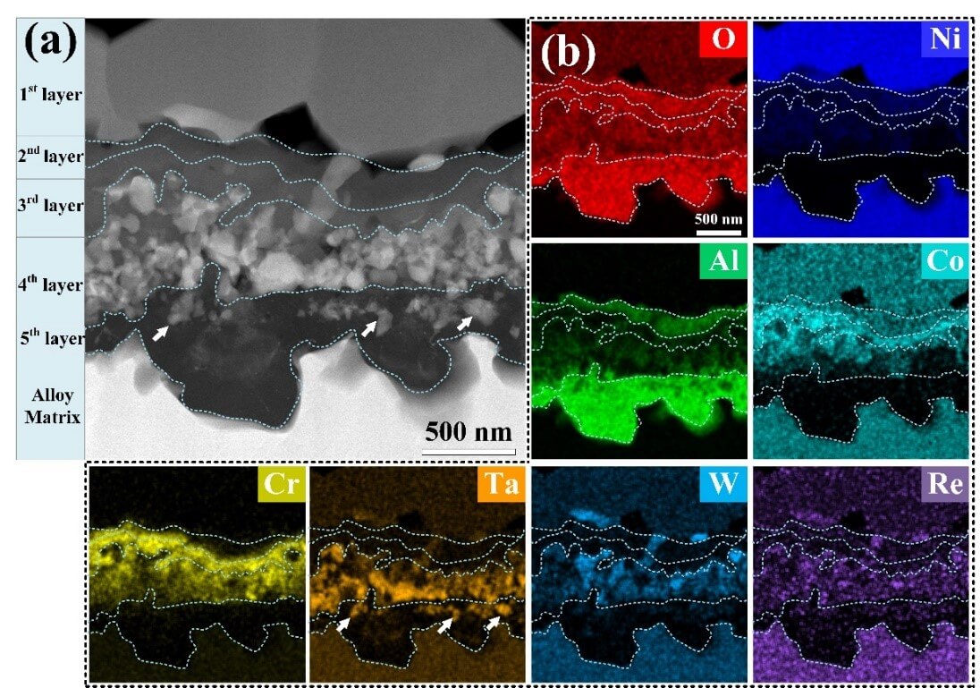 3. 中间层的转变(120秒至30分钟)(图5):位于表面的“初生”Al₂O₃层并非终点,它会随着时间推移,通过内部元素的扩散与反应,逐步分异和转化为最终的NiAl₂O₄(第2层)、CoCr₂O₄(第3层)和CrTaO₄(第4层)三层结构。