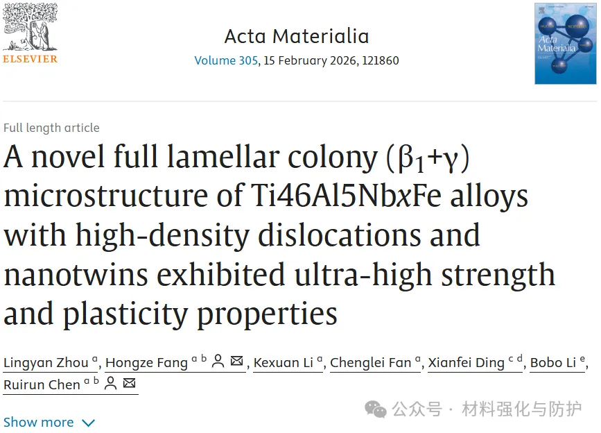 2025年12月21日,材料领域的国际期刊《Acta Materialia》在线发表了题为“A novel full lamellar colony (β1+γ) microstructure of Ti46Al5NbxFe alloys with high-density dislocations and nanotwins exhibited ultra-high strength and plasticity properties”的研究论文,论文以Ti-46Al-5Nb-xFe(x = 0–1.0 at.%)合金为研究对象,系统揭示了Fe元素对相变路径、层片组织演化及β1相稳定性的调控机制,通过合理的Fe含量设计与热处理路径控制,可在合金中形成一种由β1相与γ相共同构成的全层片群落组织。论文的通讯作者为哈尔滨工业大学的方虹泽教授和陈瑞润教授。