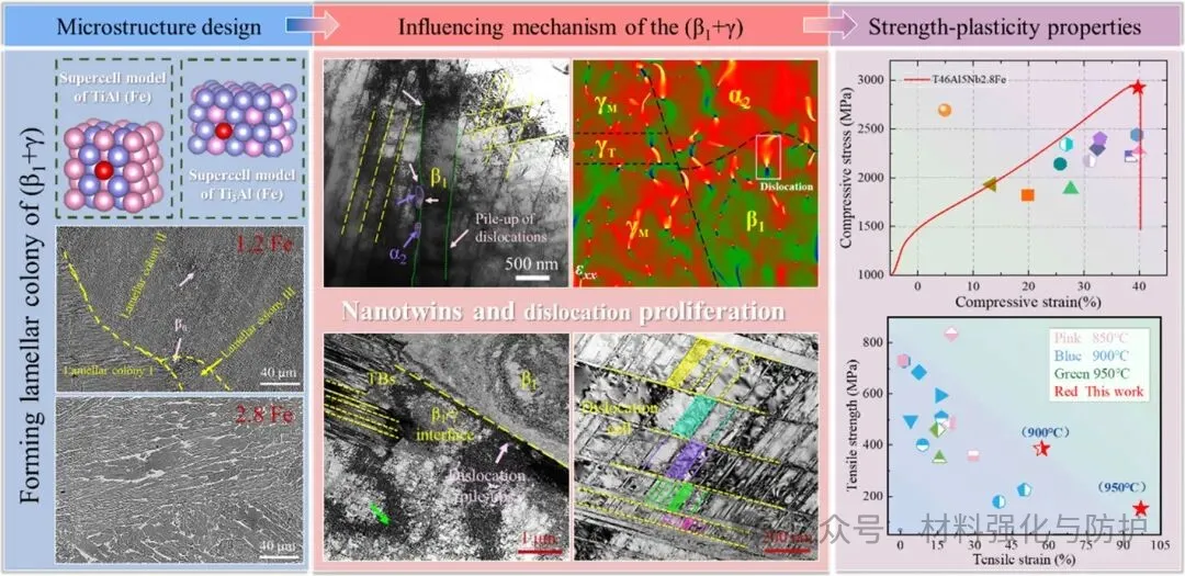 在这项研究中,团队针对γ-TiAl合金塑性与热加工性难以兼顾的问题,通过Fe微合金化诱导在Ti-46Al-5Nb-xFe合金中构建全层片β1+γ群落显微组织(LPM)。研究发现,Fe元素优先富集于β1相并取代传统α2层片,使β1/γ层片在尺度与取向上高度有序,同时在界面处形成显著的晶格失配与化学非平衡,β1/γ界面界面主导的缺陷演化机制显著提升了位错储存能力与应变硬化水平,实现了强度与塑性的协同提升。