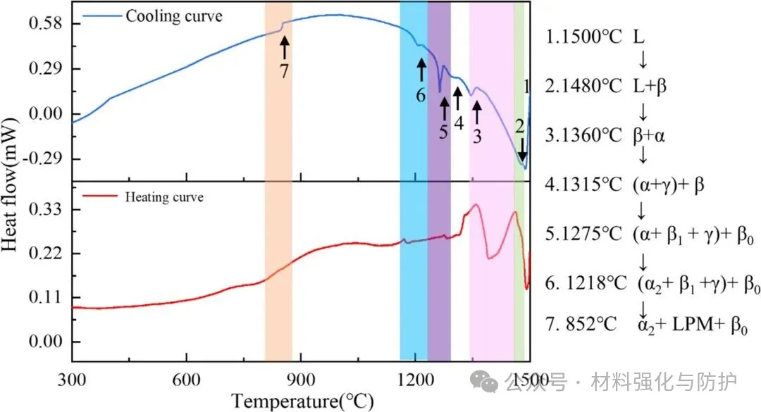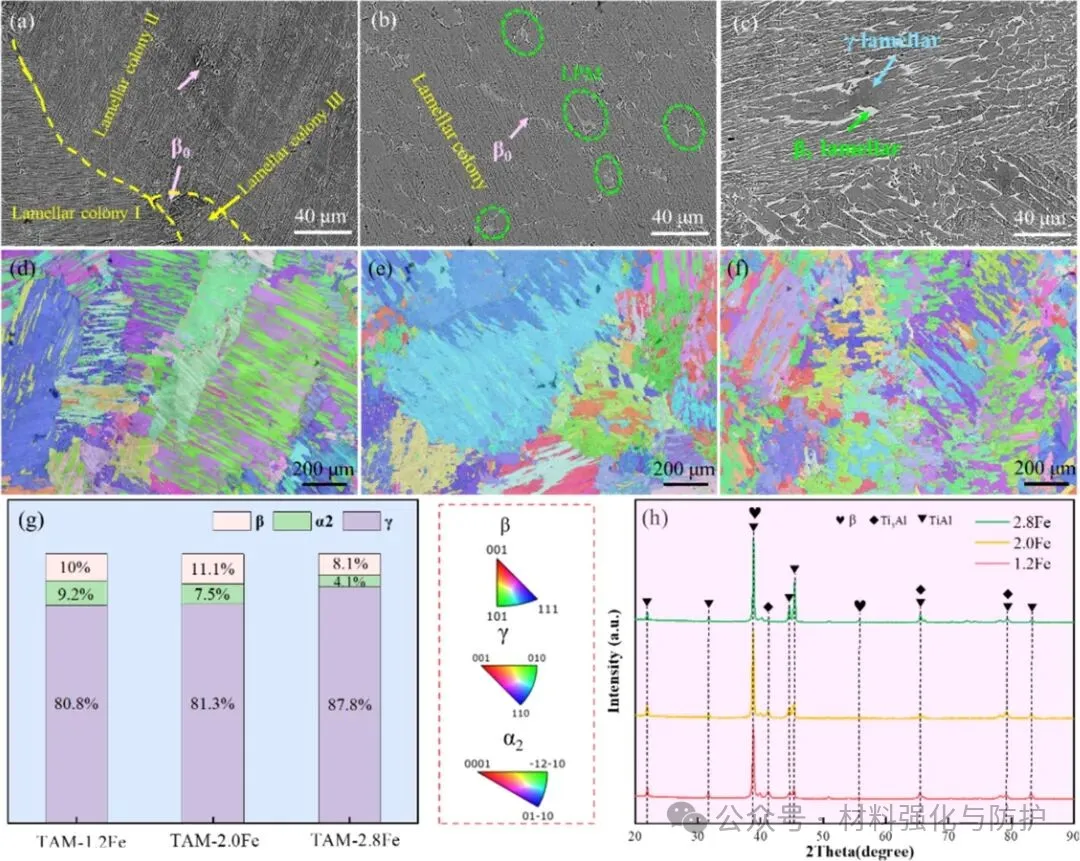 团队以钛、铝、铁等高纯元素金属,以及Al-63Nb(wt.%)中间合金,设计了成分为Ti-46Al-5Nb-xFe(x=1.2,2.0,2.8at.%)的合金,称为Tan-XFe合金。钢锭通过电弧炉熔炼完成并进行了五次重熔以确保成分均匀。随后铸锭经均匀化与受控热处理后,团队系统表征其显微组织演化,研究综合使用了XRD、SEM、EBSD与TEM等手段,对相组成、层片取向关系及界面特征进行深入分析,并结合相变理论对β1相的形成机制进行了系统讨论。
