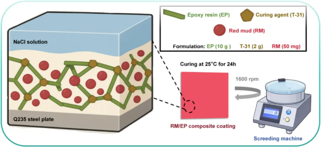 赤泥原料的初始处理包括在110℃下干燥2小时,随后通过175目筛网筛分,获得未改性材料,命名为RM。改性RM样品通过煅烧工艺制备:将3克RM置于坩埚中,在马弗炉中以5℃/min的升温速率加热至不同目标温度(250℃、350℃和450℃)。在目标温度下保持2小时后,样品自然冷却至室温。在不同温度下煅烧的RM样品分别命名为RM-X(X=250、350和450)。随后将改性RM材料单独加入环氧树脂(EP)中并均匀分散,确保RM与EP的质量比为1:200。接着向混合液中加入固化剂,使EP与固化剂的比例达到5:1。随后加入少量消泡剂和无水乙醇,将混合液在室温下搅拌15分钟制得涂层液。最后通过旋涂工艺(转速1600转/分钟)将预定体积的涂覆液涂覆于Q235钢表面,经25℃固化24小时后获得复合涂层体系,命名为RM/EP-X(X=250、350和450)。 所制得的复合涂层在模拟海洋环境中对Q235碳钢基材展现出卓越的综合防护性能。电化学阻抗谱(EIS)显示,RM/EP-350涂层在3.5 wt%氯化钠溶液中浸泡60天后仍保持优异的耐腐蚀性,阻抗半径高达2.69×106Ω·cm2。值得注意的是,该复合材料具有出色的抗生物污损能力,在光照条件下对大肠杆菌的抑制率达99.4%,对金黄色葡萄球菌的抑制率达99.6%,同时藻类附着极少。 本研究首次将RM作为功能性填料应用于防腐涂层,展现出卓越的耐腐蚀性和防污性能。 合成步骤示意图 RM/EP复合涂层合成步骤示意图。 防腐机制示意图 RM/EP复合涂层防污防腐机制示意图。 数据来源与出处 相关研究成果以“Utilization of red mud waste in epoxy resin composite coatings for corrosion and biological contamination resistance”为标题发表在《Chemical Engineering Science》上。