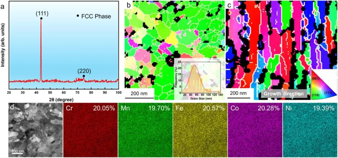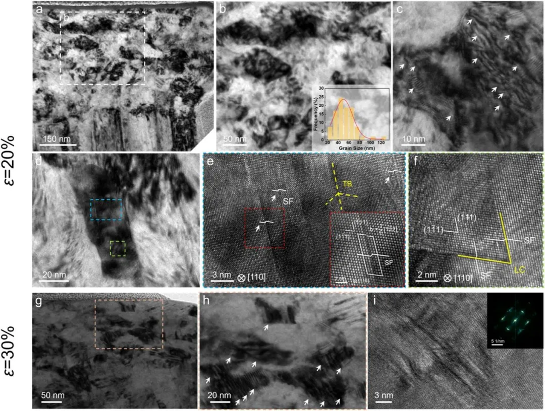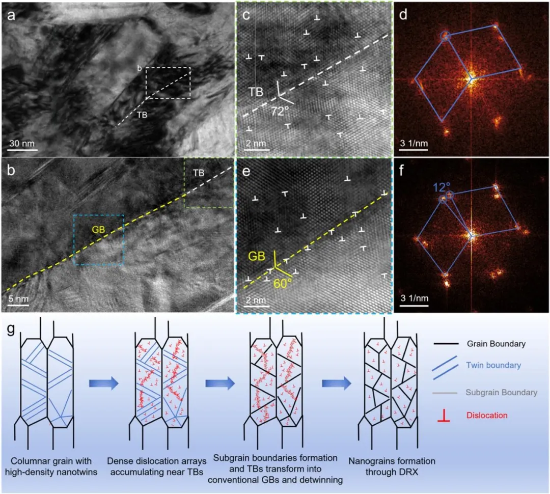 图1 NTNC HEA的微观结构表征。(a)XRD图谱证实了单相FCC结构。TKD IPF图谱从(b)样品的平面图和(c)样品的横截面图获得。(b)中的插图显示了相应的晶粒尺寸分布。(d)STEM-EDS元素图谱显示了合金的均匀化学成分。 图2 NTNC HEA的微观结构表征。(a)沿生长方向的沿着TEM图像,白色箭头指示样品生长方向。(b)样品的平面视图明场TEM图像。(c,d)平面视图取向的HRTEM图像。TB和SF用彩色虚线和白色箭头标记。(e)样品的截面明场TEM图像。(f)(e)中的选择区域的Magnetic HRTEM图像。 图3 NTNC HEA的机械性能。(a)来自沿着样品生长方向进行的微柱压缩试验的工程应力-应变曲线。插图SEM图像显示了微柱变形前后的结果。(b)应变硬化速率作为真实应变的函数,示出了由灰色虚线分隔的三个变形阶段:阶段I-由于剪切带形成而屈服后的急剧下降;第二阶段-硬化率上升后下降,归因于DRX诱导的晶粒细化和随后的去孪晶;阶段III-硬化速率接近于零,表明稳定的塑性流动由GB介导的等轴晶粒的变形和持续的去孪晶主导。(c)与其他合金的屈服强度和均匀应变的比较。NC和CG代表纳米晶和粗晶结构。 图4 NTNC HEA在不同压缩应变下的变形机制。(a-c)压缩至7%应变的微柱的TEM图像。(a)由白色箭头指示的剪切带的形成。(b)(a)中区域的磁共振图像。(c)显示柱状晶粒内位错的暗场TEM图像。压缩至13%应变的微柱的TEM图像:(d)剪切带附近新晶粒的形成,如蓝色箭头所示;(e)(d)中区域的磁共振图像,白色箭头突出显示新形成晶粒内的位错线;(f)剪切带附近的SAED图案。 图5 不同压缩应变下NTNC HEA的变形机制。压缩至20%应变的微柱的TEM图像:(a)在剪切带内观察到的显著动态DRX;(b)(a)的放大视图,显示具有约50nm的平均尺寸的DRX晶粒;(c)DRX晶粒内的高密度位错,如白色箭头所示;(d)选择用于HRTEM分析的DRX晶粒的双视场TEM图像,其中蓝色和绿色虚线框分别指示(e)和(f)中所示的区域:(f)Lomer-Cottrell位错锁的形成.压缩到30%应变的微柱的TEM图像:(g)在再结晶晶粒中发生GB畸变;(h)在DRX晶粒内观察到的位错线由白色箭头指示;(i)HRTEM图像和相应的FFT图案显示晶粒内不存在纳米孪晶。 图6 通过亚晶形成的位错介导的动态再结晶。(a)狗骨形拉伸试样的TEM图像,黑色双箭头指示拉伸方向。(b)变形诱导的TB处高密度位错阵列的累积,其中位错和TB由白色箭头和虚线标记。(c)HRTEM图像,显示了由与TB相邻的黄色虚线表示的亚晶界形成。(d)(c)的磁共振图像,清楚地显示出亚晶界处约13°的取向差。白色符号“Ʇ”表示位错。 图7 TB向常规GB的转变。(a)TEM图像,显示了在变形过程中晶粒内由白色虚线表示的弯曲TB。(b)界面区域的HRTEM图像,揭示了沿着同一边界的结构变化。(c,d)Magnetic HRTEM图像和(b)中右上区域的相应FFT图案。位错和TB分别用白色“Ʇ”符号和虚线标记。(e,f)来自(B)中左下区域的Magnetic HRTEM图像和FFT图案,显示了具有60°取向差的常规GB。(g)NTNC HEA的柱状晶粒在变形期间的DRX过程的示意图。 本文的研究成果如下: (1)通过磁控溅射技术制备出具有高密度预存纳米孪晶的纳米晶(NTNC)CrMnFeCoNi高熵合金,该合金呈现单相面心立方(FCC)结构,柱状晶粒平均尺寸约60nm,纳米孪晶与堆垛层错(SFs)在薄膜中均匀分布,平均孪晶宽度约3nm,且无元素在孪晶界面偏聚现象。 (2)微观柱体压缩实验显示,该合金屈服强度高达2.3GPa,压缩应变超过40%;拉伸实验中,标距段伸长量对应工程拉伸应变约31%,在屈服强度-均匀应变对比中,其性能显著优于众多传统纳米晶与粗晶材料,突破了纳米晶材料常见的强度-延展性权衡难题。 (3)明确室温变形时,剪切带内于约10%应变时激活动态再结晶(DRX),形成平均尺寸约50nm的等轴纳米晶粒。新生成的高角度晶界(HAGBs)可提高界面密度、阻碍位错运动,使流动应力提升至2.75GPa;同时,等轴晶粒的晶界能促进大应变下晶界介导的变形,配合去孪晶过程,有效抑制剪切局部化,实现稳定塑性流动,且应变硬化率呈现三阶段演变特征,分别与剪切带形成、DRX与去孪晶作用、晶界介导变形相关。 (4)通过拉伸实验揭示两种相互关联的纳米孪晶辅助动态再结晶(ntDRX)机制,一是位错在孪晶界(TBs)堆积,经位错重排形成亚晶界并演变为高角度晶界;二是共格孪晶界通过与位错相互作用直接转变为高角度晶界,且两种机制协同使DRX在较低应变(约13%)下即可启动,无需极高应变或高应变率条件。 (5)证实纳米孪晶在合金中兼具强化与促进DRX的双重功能,既通过阻碍位错运动、储存位错提升屈服强度与应变硬化能力,又作为位错堆积优先位点,为DRX提供有利形核条件,间接改善材料变形能力,为纳米晶高熵合金性能优化提供新的微观结构调控思路。