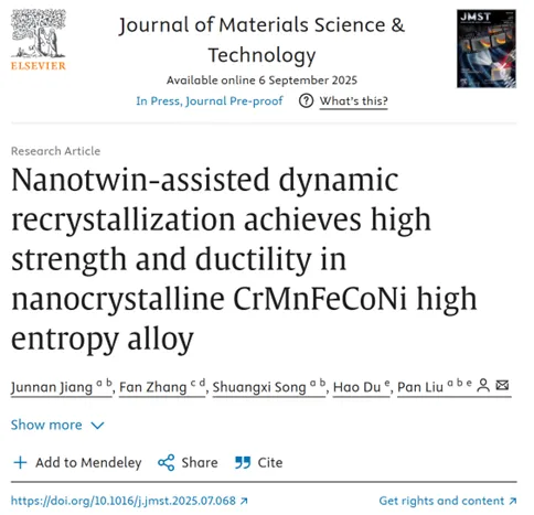 导读:纳米晶(NC)高熵合金(HEAs)具有上级强度,但由于位错活动受到抑制和有限的应变硬化,通常表现出较差的塑性。动态再结晶(DRX)被认为是提高粗晶材料塑性和强度的有效机制。然而,其在室温下在NC HEAs中的活化通常受到不充分的热活化和对极高局部应变的要求的限制。本文通过纳米孪晶辅助动态再结晶(ntDRX)机制,在CrMnFeCoNi-HEA合金中引入高密度的纳米孪晶,显示出单相面心立方(FCC)微柱压缩测试表明,其屈服强度高达2.3GPa,压缩应变超过百分之四十。在变形过程中,除了位错滑移和晶界活动外,剪切带内的动态再结晶被激活,导致等轴纳米晶粒的形成。这些新形成的晶粒增加了界面密度,阻碍了位错运动,并将流动应力提高到2.75GPa。此外,新形成的等轴晶粒的晶界促进了大应变下的晶界介导变形,此外,拉伸实验揭示了两种相互关联的ntDRX机制:一种是位错在孪晶界(TB)处聚集,通过位错重排形成亚晶,并演化为大角度晶界(HAGB);另一种是通过位错相互作用将共格TB直接转变为HAGB。这项研究提出了在NC HEAs的室温DRX的理解,并强调nanotwin工程作为一个有前途的策略,优化机械性能。 纳米晶(NC)高熵合金(HEAs)虽具备优异强度,但常因位错活动受抑与应变硬化能力有限而表现出较差延展性。动态再结晶(DRX)是改善粗晶材料塑性与强度的有效机制,然而在室温条件下,纳米晶高熵合金中DRX的激活往往受限于热激活不足与极高局部应变需求,这一难题成为制约纳米晶高熵合金综合性能提升的关键瓶颈。 上海交通大学、北京理工大学的团队通过磁控溅射技术,成功制备出具有高密度预存纳米孪晶的纳米晶(NTNC)CrMnFeCoNi高熵合金。该合金呈现单相面心立方(FCC)结构,柱状晶粒平均尺寸约60nm,且纳米孪晶与堆垛层错(SFs)在薄膜中均匀分布。微观柱体压缩实验表明,其屈服强度高达2.3GPa,同时压缩应变超过40%;拉伸实验中,标距段伸长量对应工程拉伸应变约31%,在屈服强度-均匀应变对比中,显著优于众多传统纳米晶与粗晶材料,实现了强度与延展性的协同优化。 变形过程中,该合金的力学行为与微观结构演变密切相关。室温变形时,除位错滑移与晶界(GB)活动外,剪切带内于约10%应变时激活DRX,形成等轴纳米晶粒(平均尺寸约50nm)。新形成的高角度晶界(HAGBs)可提高界面密度、阻碍位错运动,使流动应力提升至2.75GPa;同时,等轴晶粒的晶界促进大应变下晶界介导的变形,抑制剪切局部化,配合部分位错滑移驱动的去孪晶过程,共同实现稳定塑性流动。应变硬化率曲线呈现三阶段特征:屈服后因剪切带形成骤降(I阶段)、DRX晶粒细化与去孪晶作用下先升后降(II阶段)、大应变下晶界介导变形主导使硬化率趋于零(III阶段)。 此外,拉伸实验揭示了该合金中两种相互关联的纳米孪晶辅助动态再结晶(ntDRX)机制:一是位错在孪晶界(TBs)处堆积,通过位错重排形成亚晶界,进而演变为高角度晶界;二是共格孪晶界通过与位错相互作用,直接转变为高角度晶界。这两种机制协同作用,使DRX在较低应变(约13%)下即可启动,突破了室温下纳米晶材料需极高应变或高应变率才能激活DRX的限制。该研究不仅深化了对纳米晶高熵合金室温DRX机制的理解,更为通过纳米孪晶工程优化纳米晶高熵合金力学性能提供了重要思路。 相关研究成果以“Nanotwin-assisted dynamic recrystallization achieves high strength and ductility in nanocrystalline CrMnFeCoNi high entropy alloy”发表在Journal of Materials Science & Technology上 链接:https://www.sciencedirect.com/science/article/pii/S100503022500893X