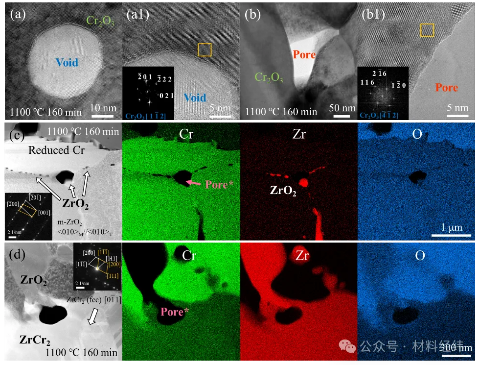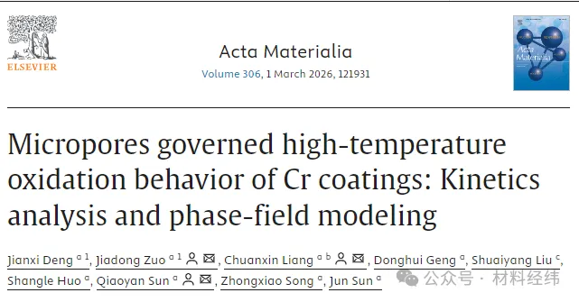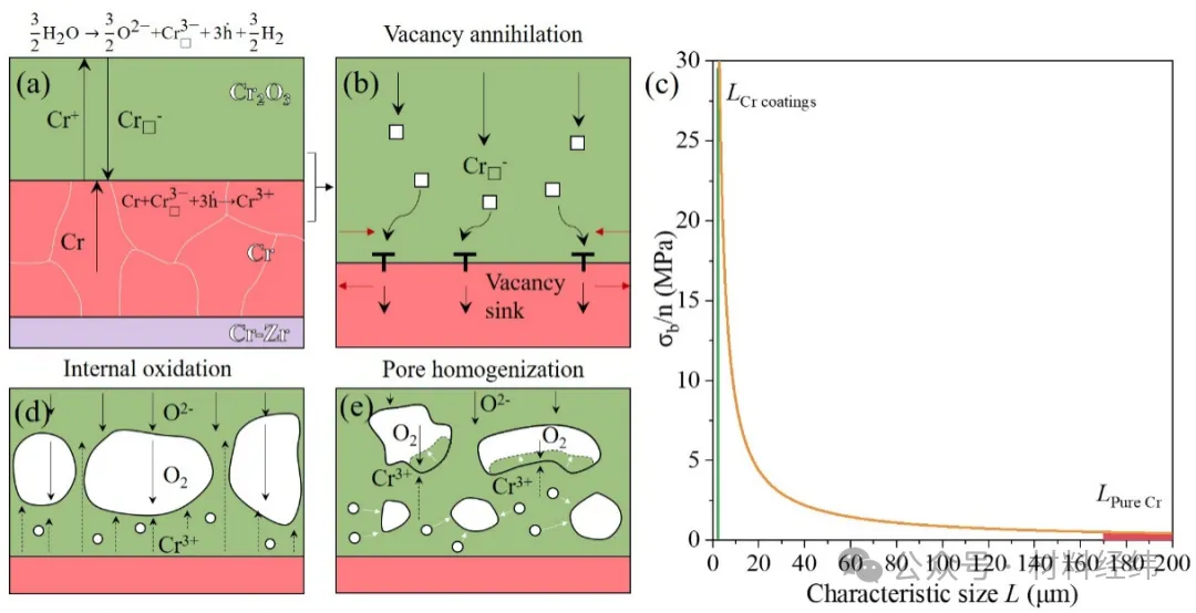 自从2011年福岛核电站爆炸发生灾难性事故后,事故容错核燃料(Accident Tolerant Fuel,ATF)的研发成为核电领域下一代先进核材料的重要方向。Cr涂层因其优异的耐腐蚀性、中子辐照耐受性、与锆基体良好的结合性等特点备受关注,而且Cr涂层不改变现有核燃料组件结构和制备工艺,成为目前最具经济性和可行性的事故容错核材料的包壳涂层材料。已有的研究多关注Cr涂层的氧化产物以及ZrO2形成后的涂层失效机制,而忽视了氧化中Cr涂层中的组织结构演变及其对氧化进程的作用,尤其关于Cr涂层在氧化过程中的孔洞形成与演化规律少有研究。 西安交通大学金属材料强度全国重点实验室孙军院士团队通过原位热重分析、多尺度微观表征与相场模拟相结合的系统研究方法,揭示了微孔主导Cr涂层高温氧化动力学转变的核心机制,为评估Cr涂层在冷却剂损失事故(Loss-Of-Coolant Accident,LOCA)条件下的结构完整性和防护性能提供了全新的视角。 本研究成果近期以Micropores governed high-temperature oxidation behavior of Cr coatings: kinetics analysis and phase-field modeling为题发表在国际材料科学与工程领域综合类著名学术期刊Acta Materialia上。 西安交通大学材料学院博士生邓鉴玺和左家栋副教授为论文共同第一作者,通讯作者为左家栋副教授、梁传鑫博士后和孙巧艳教授,孙军院士和宋忠孝教授为项目核心指导者。西安交通大学金属材料强度全国重点实验室为论文唯一通讯单位。 研究发现Cr涂层在高温水蒸气环境中随时间延长的氧化增重行为呈现清晰的三阶段动力学特征(图1): 第一阶段(0–20 min)为抛物线型氧化增重,Cr表面快速形成致密Cr2O3层,氧化速率由离子扩散控制; 第二阶段(20–160 min)出现偏离抛物线的形式,Cr2O3层中因阳离子空位聚集形成微孔,加速氧离子向内扩散,氧化模式从“外部生长”转向“内部生长”; 第三阶段(≥240 min)为加速线性氧化,Zr向外扩散与Cr2O3发生氧化还原反应,伴随柯肯达尔效应形成Cr/Zr界面孔洞(图2),涂层剥离导致氧化速率急剧上升。 图1 在1100 ℃水蒸气中氧化后试样的形貌与增重曲线:(a) Cr涂层Zr-1Nb合金宏观形貌,(b) Zr-1Nb、Cr涂层Zr-1Nb和纯Cr金属试样的氧化增重曲线 图2 在1100 ℃水蒸气中氧化160 min后Cr2O3及Cr涂层中孔洞结构特点: (a),(a1),(b),(b1) 纳米级和微米级孔洞结构,(c) Cr2O3-Zr氧化还原反应引发Cr涂层晶界处形成孔洞,(d) 柯肯达尔效应导致Cr涂层/Cr-Zr扩散层界面形成孔洞 这种独特的动力学转变机制,核心源于“空位聚集-微孔合并-结构失效”的连锁效应: Cr涂层的小尺度特征尺寸(微米尺度的涂层厚度和晶粒尺寸)导致背应力升高,抑制界面位错运动,降低空位湮灭效率,促使Cr2O3内部形成微孔(图3);微孔不仅阻碍Cr阳离子向外扩散,还为氧离子提供快速扩散通道,引发氧化模式转变;后续Zr原子扩散引发的氧化反应与界面孔洞粗化,进一步破坏了涂层完整性,最终导致加速氧化。研究团队通过相场模拟,直观地演示了微孔演化与氧化动力学的耦合过程,进一步验证了微孔对涂层氧化行为的核心调控机制(图4)。 图3 蒸气环境下Cr2O3孔洞形成机制。(a) 阳离子空位聚集,(b)-(c) 高背应力的Cr涂层导致Cr/Cr2O3界面处空位湮灭效率降低引发孔洞形成,(d) 孔洞阻止金属阳离子向上扩散,(e) 孔洞均匀化过程。 图4 Cr涂层从抛物线到直线氧化增重阶段Cr2O3孔洞结构演变的相场模拟:(a) 氧化膜结构,空位浓度和氧化位点的协同演化过程(模拟视频切片),(b) 外生长和内生长氧化膜厚度随时间变化,(c) 模拟的Cr涂层从抛物线转折到直线阶段的氧化增重曲线。 本研究首次明确微孔也是Cr涂层高温氧化动力学转变的关键因素。为核反应堆ATF材料的涂层设计、寿命评估提供了关键结果和依据。同时,研究融合实验表征与相场模拟的研究范式,为Cr涂层高温氧化机制解析提供了新参考。 研究工作得到国家自然科学基金(U21B2057、52301168、52394163)等项目资助,测试表征得到西安交通大学分析测试共享中心和材料学院实验技术中心的大力支持。 论文链接: https://doi.org/10.1016/j.actamat.2026.121931