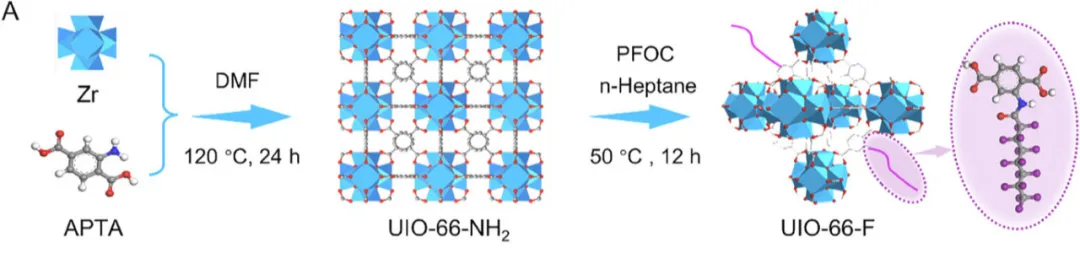 通过分子设计合成氟化UIO-66(UIO-66-F)纳米颗粒,然后通过多层喷涂工艺与环氧树脂(EP)相结合,制得UiO-66-F/EP复合涂层。 所制备的涂层在多种表面(包括Q235钢和陶瓷)上具有优异的附着力和基材普适性。该涂层表现出卓越的耐腐蚀性、显著的防冰能力、优异的自清洁性能和强大的机械强度。该涂层具有优异的超疏水性,水接触角为165°,并且在3.5wt% NaCl溶液中浸泡60天后仍能保持稳定的防护性能,其低频阻抗模量仍比未涂覆涂层的Q235钢高出约7个数量级。该涂层还具有优异的耐磨性和耐久性。此外,基于分子动力学模拟和表面能理论分析,从低表面能特性和微/纳米分级结构两方面系统阐述了其保护机理。 本研究为开发高性能防护涂层提供了理论见解和技术途径,在海洋工程、化工设施和基础设施等恶劣环境中展现出广阔的应用潜力,推动了超疏水涂层朝着多功能性和长期可靠性的方向发展。 合成过程 UIO-66-F纳米颗粒的合成过程与微观结构演变。 涂层制备示意图 (A)UIO-66-F/EP复合涂层制备过程的示意图;(B-D)Q235钢、EP涂层和UIO-66-F/EP复合涂层的数字照片(左)和SEM图像(右);(E-G)Q235 钢、EP涂层和UIO-66-F/EP复合涂层的AFM图像。 数据来源与出处 相关研究成果以“Superhydrophobic Coatings with Perfluorinated Metal–Organic Frameworks for Enhanced Corrosion Resistance”为标题发表在《small》上。