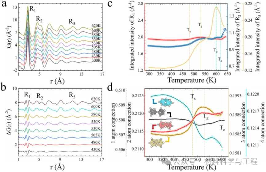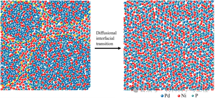 进一步的热分析揭示了一个关键现象:在低于玻璃转变温度的特定温度点,材料表现出一个异常尖锐的放热峰。通过原位高温同步辐射X射线衍射技术追踪发现,该放热峰对应着界面处发生的剧烈变化——原子堆积变得致密,中程序显著增强,同时原子团簇的连接模式从低配位向高配位转变。与之相伴的是,原本富集在界面的Ni元素开始向颗粒内部扩散,成分趋于均匀。