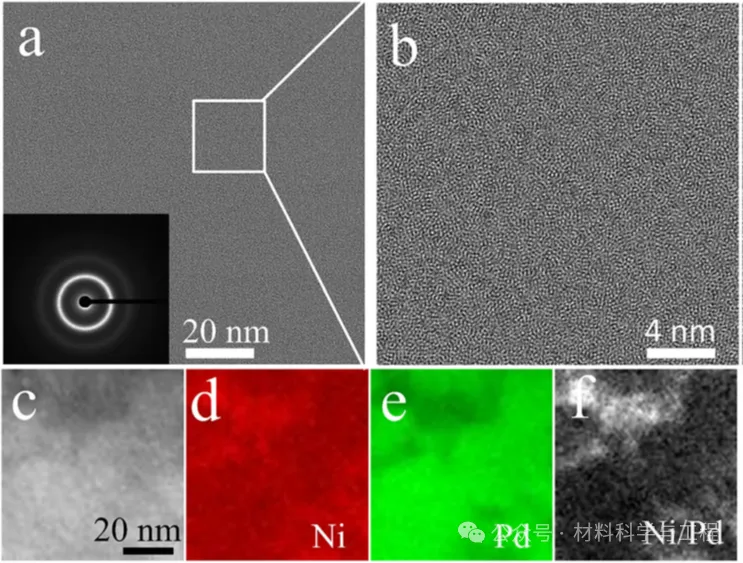图2. 非晶-非晶界面的初始状态。 (a-d) 高分辨电镜证实纳米颗粒与界面的存在;(e) 自相关函数分析表明界面原子排列更无序;(f-i) 元素面分布图清晰显示Ni在界面偏聚,Pd在颗粒内部富集。