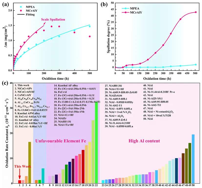 基于上述策略,中科院金属所成功研制出新型NiCoCrAlYHf多主元合金(Multi-Principal Element Alloy, MPEA)。在1200℃、500小时的等温氧化实验中,新型合金的氧化增重显著低于传统合金,其氧化速率常数仅为 1.28×10⁻¹² g²·cm⁻⁴·s⁻¹,比传统合金低约 59%。更为重要的是,在循环氧化测试中,传统合金在 70 小时后就出现氧化膜剥落,500 小时后剥落面积超过 40%,而新型合金在整个测试周期内剥落面积小于 2%,展现出卓越的膜层结合力与抗剥落性能。这一进展为发展下一代极端温度下稳定服役的热障涂层粘结层材料,奠定了关键的材料基础与设计范式。