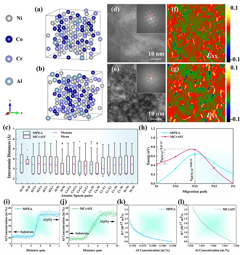 图4:两种合金ADZ中的晶格畸变和Al扩散速率的第一性原理分析:(a, b) 弛豫后的MCrAlY (a)和MPEA (b)的ADZ超胞结构;(c) 箱形图显示了超胞结构中不同原子对的1NN键长分布;(d, e) 两种合金ADZ的HRTEM图像;(f, g) GPA方法获取的HRTEM图像的原子尺度应变分布图;(h) 通过 CI-NEB 方法计算的Al在ADZ中扩散的能量势垒;(i, j) 实验获得的两种合金合金从ADZ到Al2O3膜的Al浓度分布图;(k, l) 基于图i和图j中浓度曲线利用Boltzmann-Matano方法计算得出的两种合金ADZ中Al的扩散系数D(c*)。