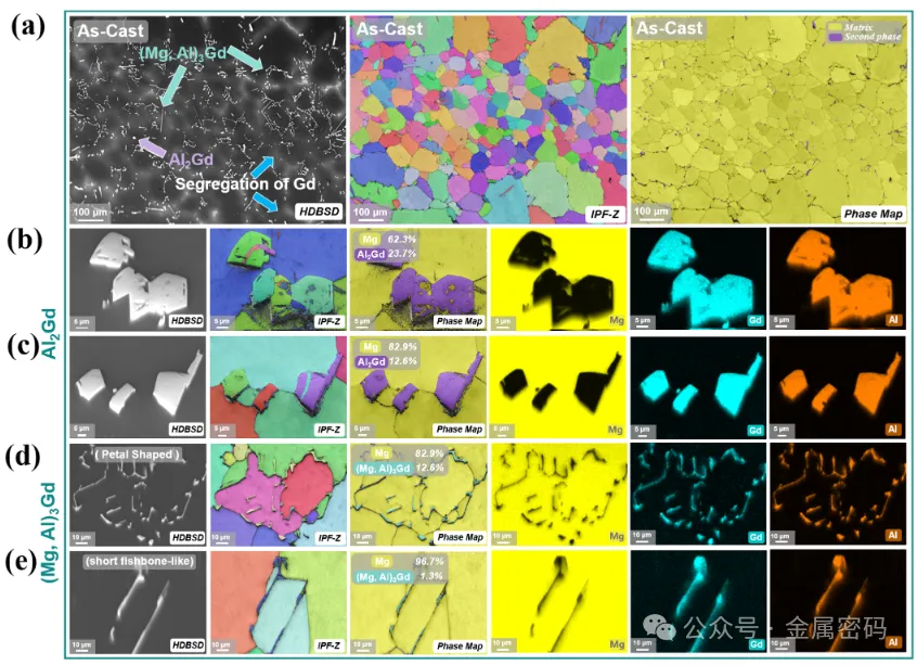 图4所示。铸态Mg-6Gd-1Al合金氧化前的EBSD分析(a)和第二相的高倍放大分析(b-e)。其中(b-c)为Al2Gd相,(d-e)为(Mg, Al)3Gd相。值得注意的是,(d)为花瓣状(Mg, Al)3Gd相,(e)为短鱼骨状(Mg, Al)3Gd相。