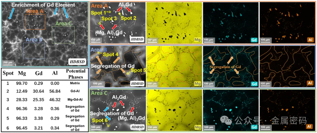 图2所示。铸态Mg-6Gd-1Al合金氧化前的SEM图像和EDS分析。高倍区域(A:橙色,B:蓝色,C:绿色)突出了Gd的晶界偏析和第二相的元素分布。斑点1-6的EDS结果揭示了第二相的元素组成。