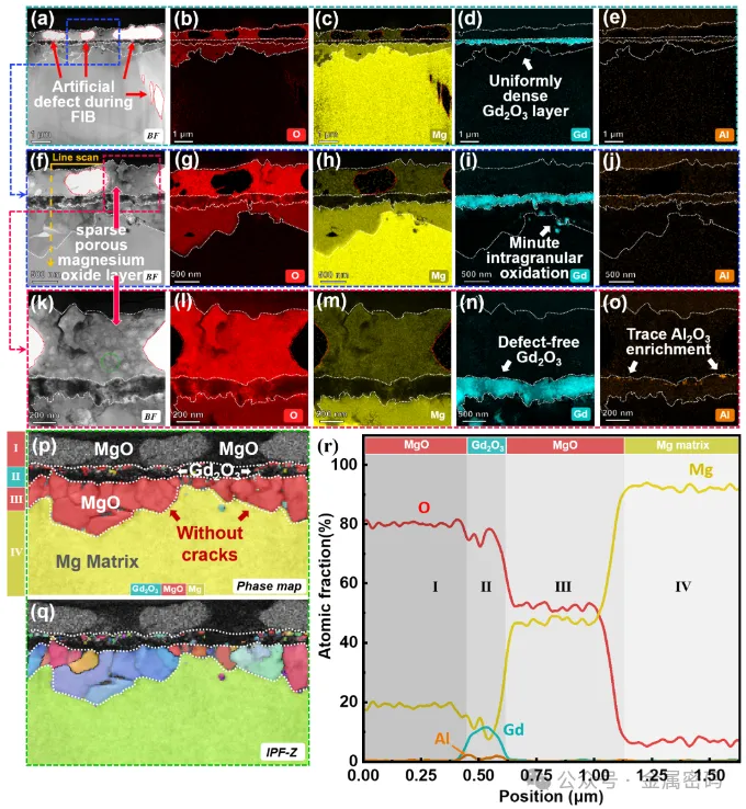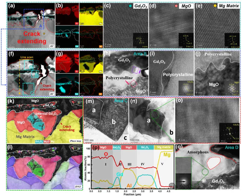 图9所示。氧化1200 h后的As铸造Mg-6Gd-1Al合金的TEM和TKD表征,样品采用FIB制备。(a)低倍率TEM-BF显示氧化皮的整体形态;(b)与(a)对应的EDS元素图;(c-e) (a)中不同区域的HRTEM图像,分别为(c) Gd2O3, (d) MgO, (e) Mg基体;(f)裂纹区域放大图((a)中蓝色框);(g)对应(f)的EDS元素图;(m) (f)中C区放大图;(n)进一步放大(m),显示两个不同的阶段;(o) (n)相a的HRTEM图像;(p)对(f)中的氧化刻度进行线扫描;(q) (f)中的D区放大,显示无定形的MgO刻度。