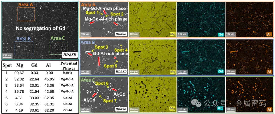 图3所示。固溶Mg-6Gd-1Al合金氧化前的SEM和EDS分析。高倍区域(A:橙色,B:蓝色,C:绿色)突出了元素在基体和第二相中的分布,表明Gd完全溶解在基体中。点1 - 7的EDS结果揭示了第二相的元素组成。