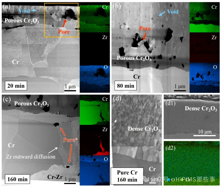 图5. Cr涂层样品和纯Cr板在1100°C氧化后的HAADF-STEM表征和相应的EDS mapping结果。(a) 20分钟, (b) 80分钟, (c) 160分钟, (d) 纯Cr板, 160分钟。(d1) 和 (d2) 是纯Cr板的截面SEM图像,表明氧化160分钟后几乎无孔隙形成。图5(a)中的橙色框为相应的EDS map扫描区域。