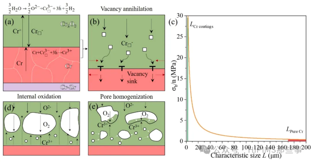 图8. 空位凝聚机制。(a) 阳离子空位成核; (b) 氧化物/金属界面处的空位湮灭; (c) Cr中背应力与特征尺寸的关系; (d) 孔隙与阳离子/阴离子扩散之间的相互作用; (e) 孔隙均匀化机制。