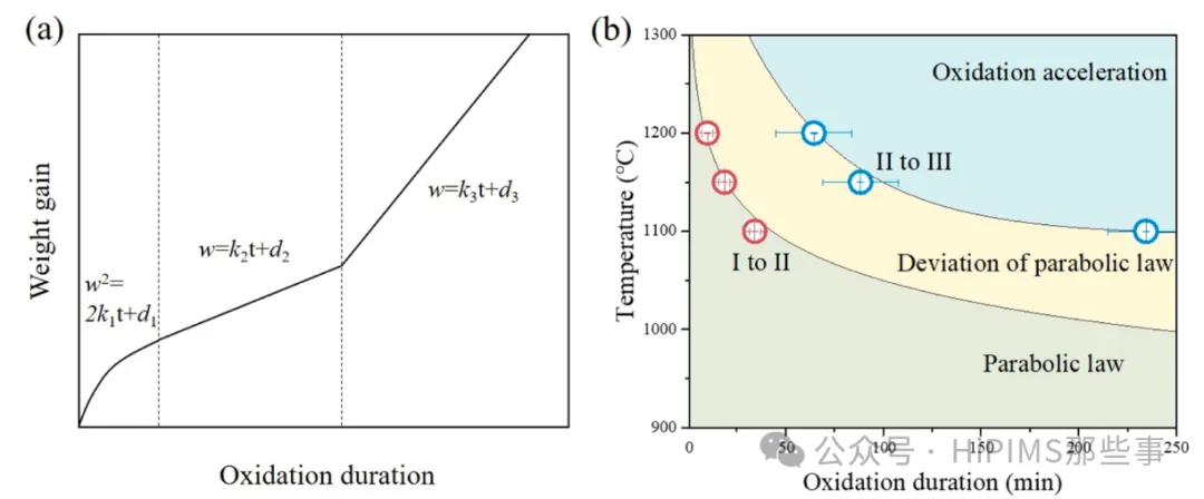 Cr涂层的氧化行为并非遵循单一的传统抛物线规律,而是表现出三个连续的阶段:
