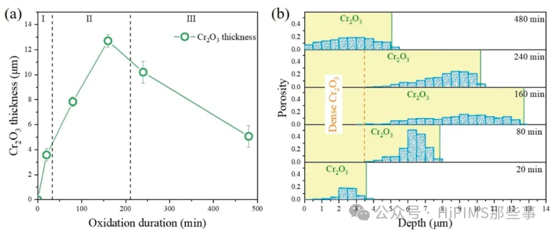 图3. 1100°C氧化20-480分钟后的厚度和孔隙率测量。(a) Cr₂O₃厚度随氧化时间的变化。(b) Cr₂O₃中孔隙率随深度的变化。
