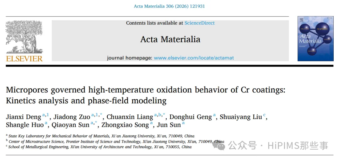 来自西安交通大学等的研究人员通过实验表征与相场模拟(Phase-Field Modeling)相结合,系统研究了Cr涂层在1000–1200°C蒸汽中的氧化行为,重点揭示了微孔演化对氧化动力学三阶段转变的主导作用。相关成果于2026年1月13日以“Micropores governed high-temperature oxidation behavior of Cr coatings: Kinetics analysis and phase-field modeling”为题发表在《Acta Materialia》。