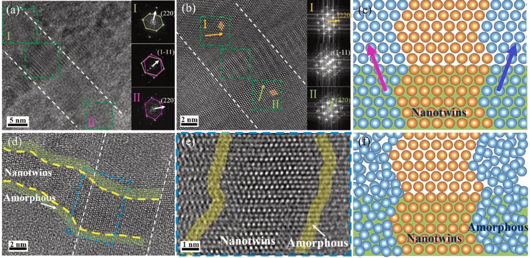 实验结果表明,TiBN诱导的TiN纳米孜晶生长存在两种路径:一是通过镜像对称外延模型实现双侧晶体结构的连续延伸;二是通过非晶带调控模型,在应力作用下促使原子面滑移形成孜晶。当TiN厚度超过临界值(10 nm)时,界面能降低和应力释放导致孜晶退化,形成常规FCC结构。对于AlN体系,其稳定的HCP结构与非晶相的共存使得孜晶在更薄的厚度(1.5 nm)下得以保留,而较厚区域则转变为非晶-纳米晶混合结构。