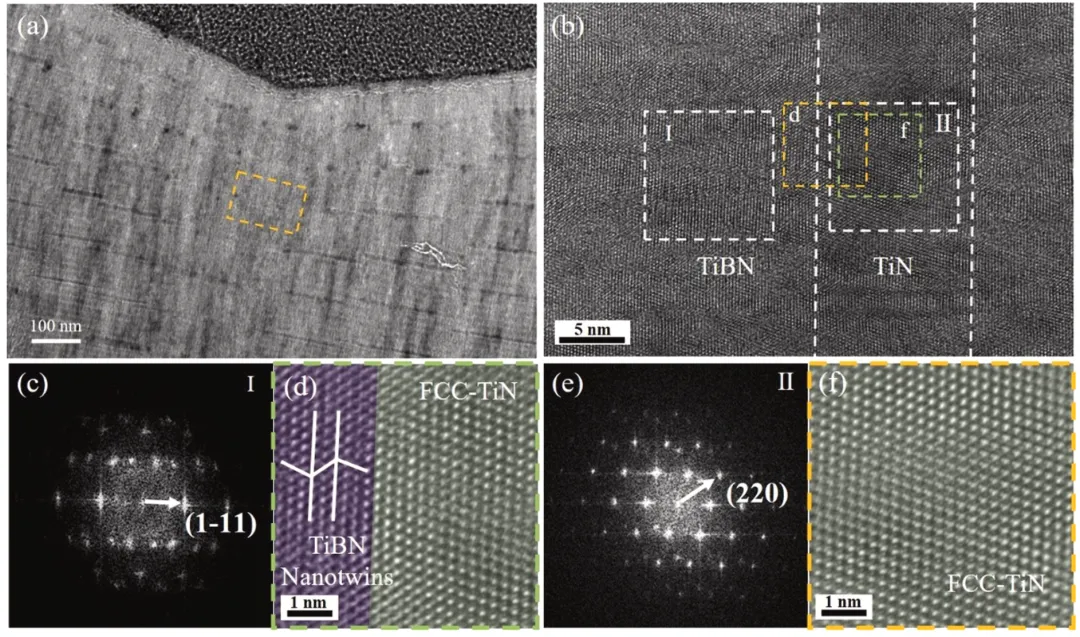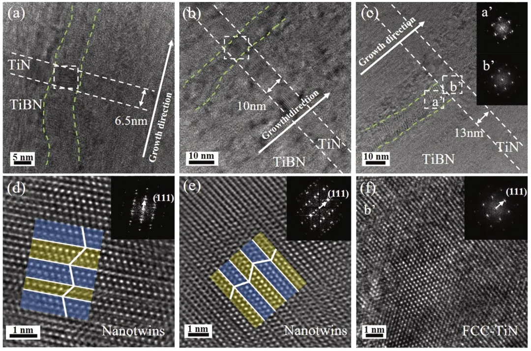 通过TiBN/TiN和TiBN/AlN多层结构设计,利用模板效应和巨大内应力,首次在超高堆垛层错能的TiN(10 nm)和AlN(1.5 nm)陶瓷层中实现纳米孪晶的跨界面生长,突破了传统陶瓷难以形成孪晶的限制。
