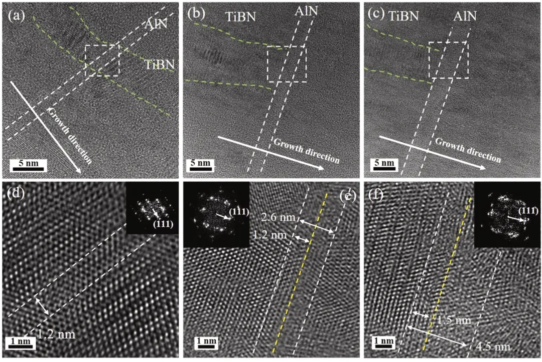 本研究选择TiN和AlN作为被诱导形成孪晶的陶瓷层,并以可独立形成高密度纳米孪晶的TiBN作为诱导层。其中,TiN用于研究与TiBN晶格常数差异较小的体系;而AlN与TiBN晶格常数差异较大且其稳定相为六方密排(HCP)结构,适合研究更复杂的诱导机制。实验结果表明,模板效应使TiBN中的结构延伸至TiN层,结合巨大的内应力,TiBN可诱导厚度为10 nm的TiN形成纳米孪晶,但无法在13 nm的TiN中实现。类似地,AlN层中也观察到孪晶诱导现象,但其相干生长区更薄。本研究最终成功实现了纳米孪晶陶瓷的跨界面生长。