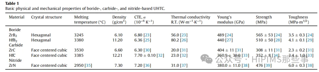 表1. 硼化物、碳化物及氮化物基 UHTC 的基本物理与力学性能