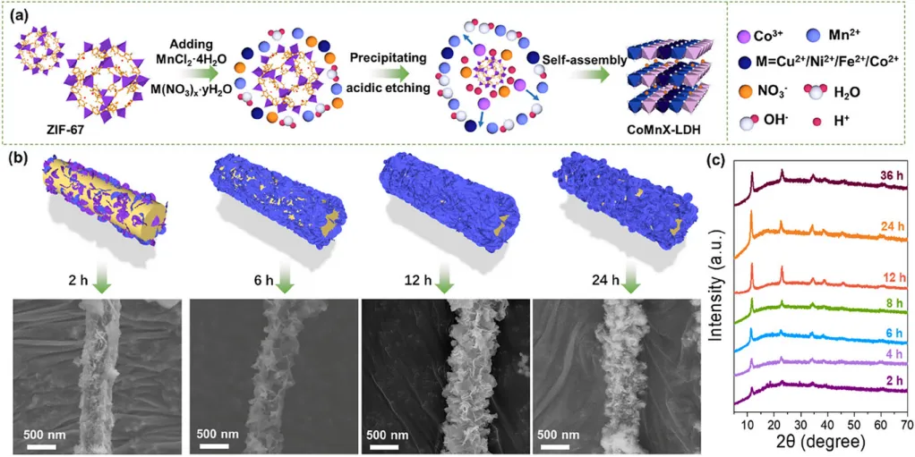 通过酸蚀-共沉淀协同机制制备了自组装LDH纳米片,时间分辨SEM与XRD显示,反应12 h后形成结晶度高、排列规整的纳米片结构,但反应时间过长会导致团聚。该策略可拓展至PAN/CoMnCu-LDH、PAN/CoMnFe-LDH等系列纳米纤维的制备,但CoMnNi-LDH表现出最窄的带隙与最优的光热性能。