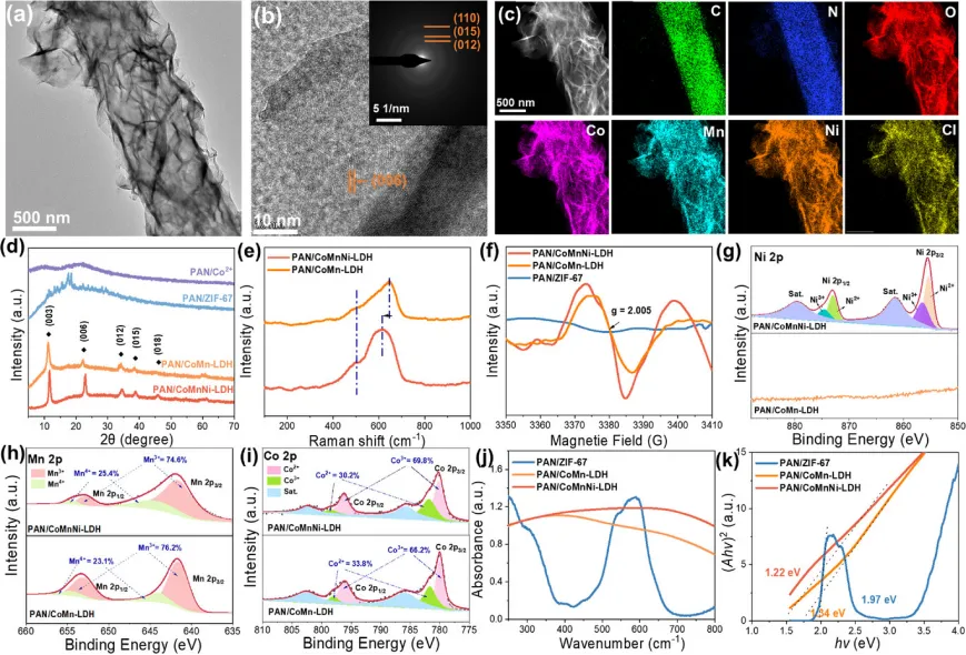 TEM与HRTEM图像显示CoMnNi-LDH纳米片垂直生长于PAN纤维表面,晶格间距0.4 nm对应(006)晶面;元素mapping证实C、N、O、Co、Mn、Ni呈均匀分布。XPS分析表明纳米纤维中Ni、Co、Mn存在多价态分布,Ni的引入导致电子重排并增加氧空位;UV-vis光谱与Tauc图显示其带隙仅1.22 eV,具备优异宽光谱吸收能力。