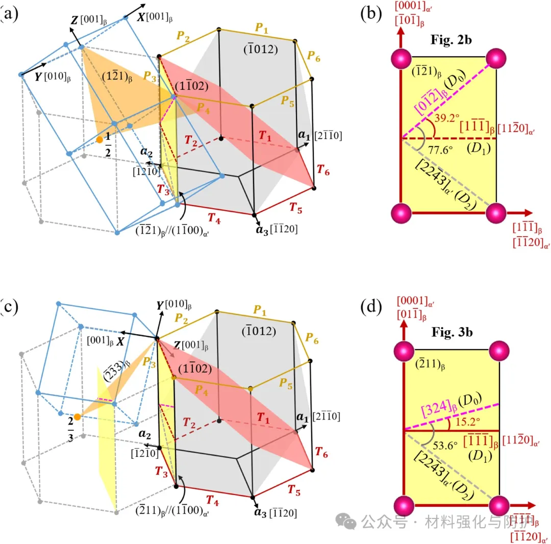 团队分析了{332}孪生带与SIMα'相界相互作用,发现二次{1012}孪生同样优先选择沿<1120>方向与相界相交的变体,相界平面与孪生平面共享<1120>轴,进一步验证了几何一致性在变体选择中的主导作用。对于SIMα'带相互作用,入射变换平面与相界的交线D0与激活孪生变体交线D1的错位角仅为39.2°,而D2的错位角达77.6°,表明小错位角更利于位错分解和孪生形核,这一原则同样适用于{332}孪生相互作用。