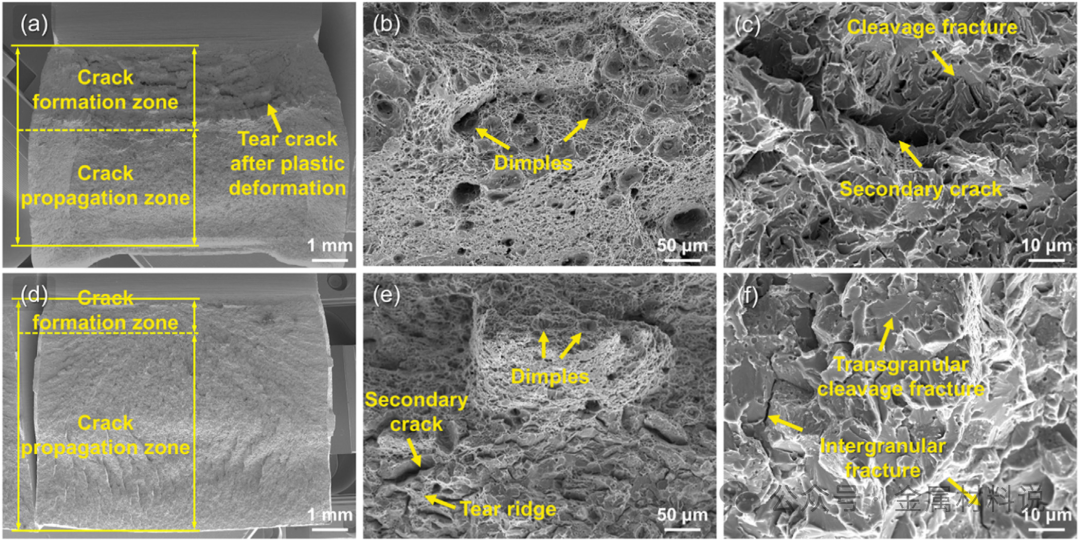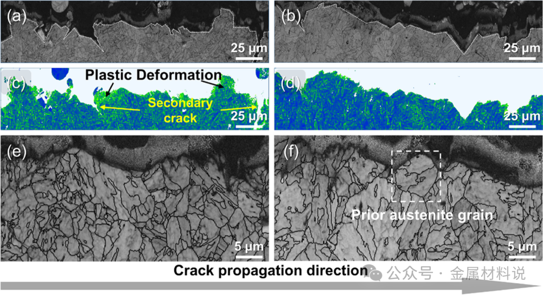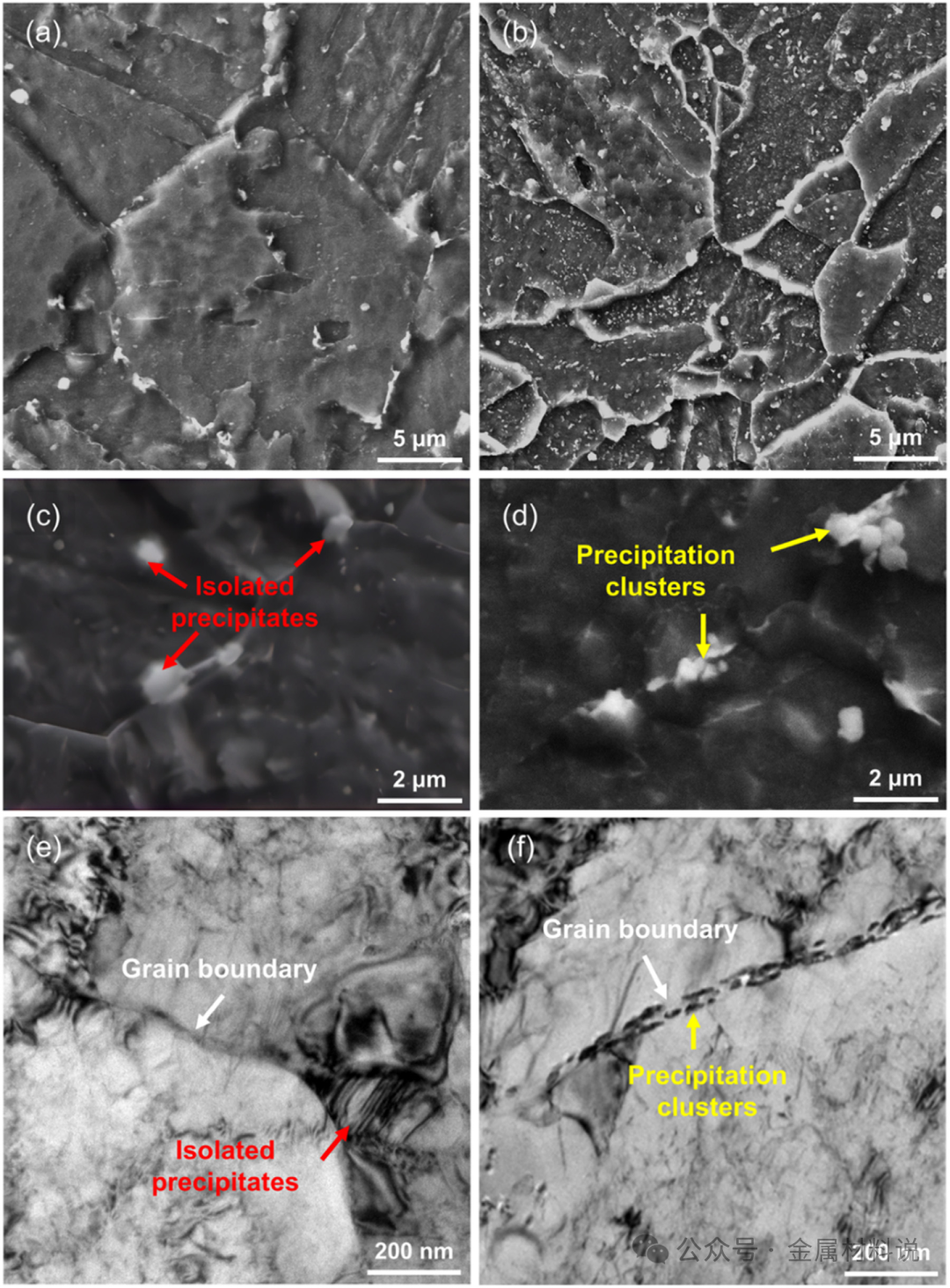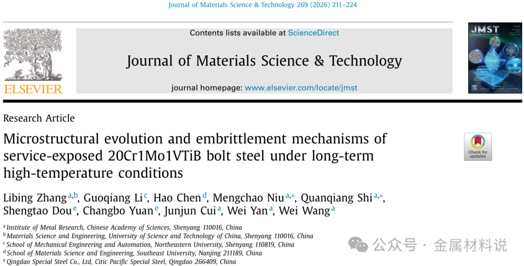 本文针对火力发电厂中广泛使用的20Cr1Mo1VTiB高温螺栓钢,在长期高温(约540℃)实际服役约1.30×10⁵小时后,系统研究了其微观组织演变与脆化机制。研究采用扫描电镜、电子背散射衍射、透射电镜和高分辨透射电镜等多种表征手段,结合热力学计算,揭示了服役过程中显微组织的显著变化:贝氏体板条粗化、位错密度降低、高角度晶界比例增加,以及沿晶界连续析出的M₆C碳化物和Laves相。这些析出相与基体形成非共格界面,产生严重的局部应力集中,并削弱晶界结合力。力学性能测试表明,长期服役导致屈服强度和抗拉强度分别从809 MPa和890 MPa下降至720 MPa和833 MPa,冲击韧性更是从132 J急剧降至34 J,断裂模式由韧性转变为脆性。研究明确了由M₂C向M₆C碳化物的转变序列及Laves相的协同析出行为,并从强化机制退化和脆性断裂路径形成两方面,阐释了性能劣化的微观机理,为评估该类高温紧固件的服役寿命及材料优化提供了重要的理论与实验依据。 部分内容解读 01 图1展示了20Cr1Mo1VTiB钢在服役前后的室温拉伸与冲击性能对比。拉伸曲线显示服役后试样屈服与抗拉强度下降,且应变硬化行为从三阶段变为两阶段。冲击载荷-位移曲线则清晰表明,服役后试样的裂纹稳定扩展阶段几乎消失,冲击吸收能量从132 J骤降至34 J,直观反映了材料服役后严重的脆化倾向。 02 图3通过SEM和TEM图像对比了服役前后析出物的形貌与分布。服役前,析出物数量较少且孤立分布在晶界;服役后,晶界处出现大量直径约40 nm的细小球状析出物,并聚集形成近乎连续的链状析出簇,TEM图像进一步证实了这种沿晶界的纳米级连续析出网络。 03 图5利用HAADF-STEM和HRTEM对服役样品中的析出相进行了精细表征。结果表明存在两种主要析出相:富含Mo、直径约93 nm的Laves相(C14结构)和富含V、直径约31 nm的M₆C型碳化物。两者在晶界相邻分布,EDS面扫描显示了清晰的元素偏聚,HRTEM与FFT分析确定了它们的晶体结构及与基体间较大的晶格失配度。 04 图7对比了服役前后试样的冲击断口形貌。服役前断口呈现明显的塑性变形特征,包括深韧窝和大量的二次裂纹;服役后断口则变得平坦,韧窝浅而大,二次裂纹减少,并以解理面和沿晶断裂特征为主,宏观和微观上均证实了断裂模式从韧性向脆性的转变。 05 图11通过EBSD技术分析了冲击断裂后裂纹扩展区域的晶界特征和局域取向差。结果表明,服役后试样中的主裂纹更加平直,偏折角度减小,更易于沿低阻力路径扩展;同时,KAM图显示服役试样裂纹尖端的局部塑性变形程度显著降低,表明析出相严重损害了材料的应变协调与裂纹尖端钝化能力。