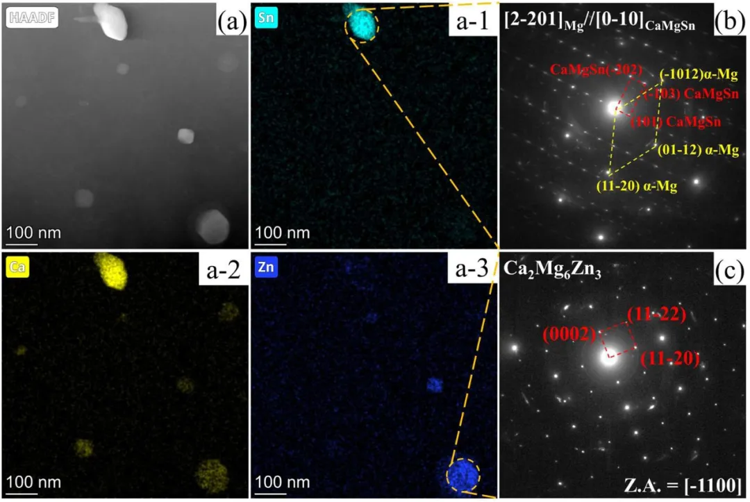 详细解读 01 图1通过电子背散射衍射(EBSD)的逆极图(IPF)和动态再结晶(DRX)晶粒尺寸分布图,展示了ZXT系列合金沿挤压方向的微观结构。所有合金均呈现由细小DRX晶粒包围变形晶粒组成的异质纤维状结构。统计结果表明,随着Sn/Ca原子比从1:4(ZXT4)降低至1:16(ZXT16),DRX晶粒的平均等效直径从3.01 μm减小到2.15 μm,而ZXT8的晶粒最粗(3.75 μm)。DRX面积分数则先增后减,ZXT8最高(55.6%)。这些差异与后续析出相的钉扎效应密切相关。 02 图5通过透射电子显微镜(TEM)分析了不同Sn/Ca原子比合金的微观结构演变。低倍明场像显示合金主要由DRX晶粒和残留的位错网络组成。未再结晶区域呈现高位错密度的层状亚结构,表明连续动态再结晶(CDRX)机制活跃。在高角度环形暗场扫描透射电子显微镜(HAADF-STEM)下观察到纳米析出相,其密度在ZXT8合金中最低,这解释了ZXT8合金再结晶驱动力较弱和DRX晶粒较粗大的原因。位错在DRX晶粒与变形晶粒界面处塞积,导致了异质变形诱导(HDI)强化。 03 图7通过高分辨率HAADF-STEM成像、EDS面扫描及选区电子衍射(SAED)对ZXT4合金中的纳米析出相进行了精细表征。EDS分析结合SAED花样鉴定出富Sn的析出相为CaMgSn金属间化合物,其与α-Mg基体存在[2-2 0 1]α-Mg // [0 -1 0]CaMgSn的晶体学取向关系。富Zn的析出相被确定为Ca2Mg6Zn3,这是Mg-Zn-Ca系合金中的典型相。这些纳米析出相对位错运动有钉扎作用,贡献了Orowan强化。 04 图8通过HAADF-STEM、高分辨TEM(HRTEM)和SAED对ZXT16合金中的富Ca相进行了表征。EDS面扫描显示该相富含Mg和Ca元素。HRTEM图像和相应的SAED花样共同证实该析出相为Mg2Ca。这些Mg2Ca析出相尺寸在45-150纳米之间,并倾向于沿晶界分布,有效阻碍了晶界迁移,从而促进了再结晶晶粒的细化。 05 图12展示了ZXT系列合金在Hank's溶液(37±0.5°C)中浸泡不同时间后的腐蚀产物膜截面形貌。经过7天浸泡后,所有合金均呈现均匀腐蚀特征。截面分析表明腐蚀产物膜具有双层结构:内层为复合氢氧化物/氧化物,外层为含吸附成核位点的磷酸钙沉积层。定量测量显示,在整个浸泡过程中,性能最优的ZXT4合金的腐蚀产物膜层最薄(约9.12 μm),而ZXT8和ZXT16的膜层较厚(分别约12.62 μm和11.29 μm),这与ZXT4合金最佳的耐腐蚀性相一致。