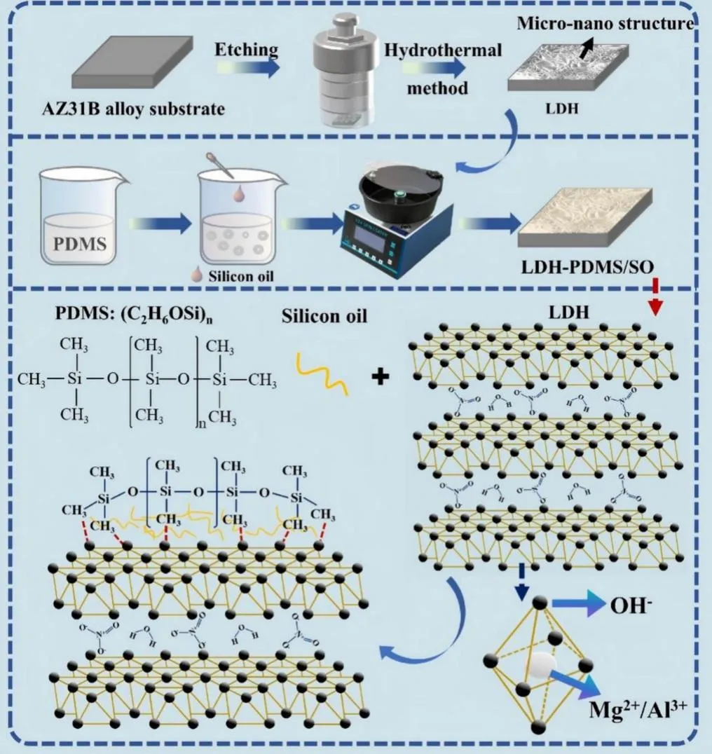 镁合金因其重量轻、比强度高、可回收性以及优异的电磁屏蔽性能,已成为航空航天、汽车制造和海洋工程等领域的关键材料。然而,由于其高化学活性和低耐腐蚀性,镁合金在日常生活和工业应用中容易受到腐蚀,尤其是在潮湿和液体环境中。此外,在寒冷环境中,结冰是一种常见的自然现象。镁合金表面的结冰和积冰问题严重影响了其在国防、航空航天和机电工业等领域的实际应用。解决镁合金的耐腐蚀性和冰附着问题对于促进经济发展和建设节能社会具有重要意义。目前,针对镁合金的防腐和防冰策略有很多,如牺牲阳极、防护涂层、机械除冰和化学除冰。其中,防护涂层因其操作简便、效果显著、成本低廉以及应用范围广泛而得到了广泛的应用。