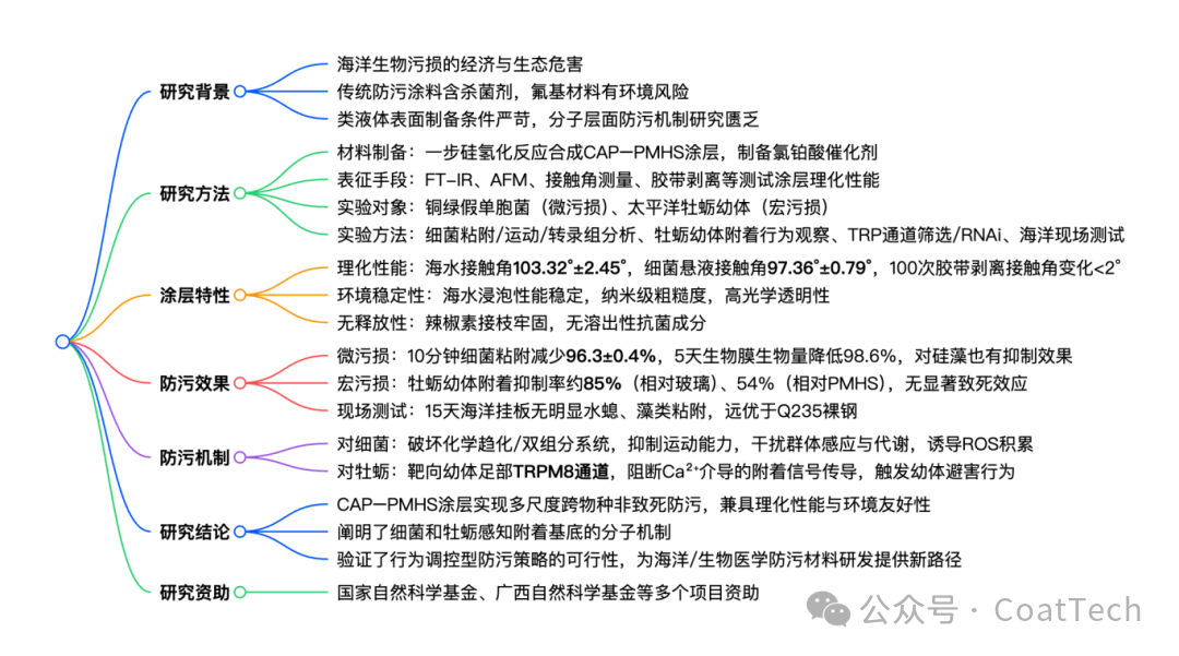 Chemical Enginnering Journal 近日,中国科学院海洋研究所的研究团队在国际知名期刊《Chemical Engineering Journal》发表最新成果,研发出一款基于辣椒素改性的CAP–PMHS 类液体防污涂层,通过干扰污损生物的表面运动和感知系统,实现了对微、宏污损生物的跨物种非致死防污,兼具优异的理化性能和环境友好性,为海洋防污技术开辟了新方向。 这款新型涂层的制备工艺简洁高效:研究团队以聚甲基氢硅氧烷(PMHS)为基底,通过一步硅氢化反应,将天然辣椒素(CAP)接枝到 PMHS 表面,成功制备出 CAP–PMHS 类液体涂层,全程无需复杂条件,易规模化生产。 经一系列表征测试,该涂层的理化性能表现亮眼:✅ 强疏水性:海水接触角达 103.32°±2.45°,细菌悬液接触角 97.36°±0.79°,水滴可轻松滑落,大幅减少生物初始粘附;✅ 超耐用性:100 次胶带剥离后接触角变化不足 2°,海水长期浸泡、砂纸磨损后性能依旧稳定,基底结合牢固;✅ 高透明性:300-800 nm 波段光学透明性与玻璃基底相当,可应用于海洋光学传感器、观测窗口等特殊场景;✅ 无释放环保:辣椒素通过共价键接枝牢固,无溶出性抗菌成分,避免对海洋环境造成二次污染。 图1:CAP–PMHS 涂层的快速制备 不同于传统 “毒杀式” 防污,这款涂层主打行为调控式防污,针对微、宏污损生物的不同特性,实现了精准且高效的抑制,实测效果令人惊艳。 研究以铜绿假单胞菌(海洋常见腐蚀性微生物)为微污损生物模型,发现 CAP–PMHS 涂层在10 分钟内即可使细菌初始粘附减少 96.3±0.4%,5 天动态培养后,生物膜生物量较纯 PMHS 涂层降低 98.6%,对硅藻等其他微生物也有广谱抑制效果。 其核心机制在于涂层能破坏细菌的化学感应系统和代谢通路:一方面显著抑制细菌的游动、群集、蹭行等运动能力,让细菌难以在表面定殖;另一方面干扰细菌的群体感应信号,减少毒力因子分泌,同时诱导胞内活性氧积累,使细菌无法形成成熟的生物膜,且脱离涂层后细菌可恢复正常增殖,真正实现 “非致死抑制”。 图2:辣椒素接枝涂层对细菌初始粘附及生物膜形成的影响 图3:辣椒素接枝对细菌运动能力及生长的影响 图4:细菌在聚甲基氢硅氧烷(PMHS)及 CAP–PMHS 表面的基因表达情况 以太平洋牡蛎幼体(典型海洋宏污损生物)为研究对象,涂层展现出极强的附着抑制效果:24 小时培养后,牡蛎幼体在涂层表面的附着密度仅为玻璃表面的 15%,附着抑制率达 85%,且幼体死亡率与空白组无显著差异,证明涂层仅抑制附着行为,不影响生物生存。 研究团队通过分子生物学手段进一步探明,涂层的作用靶点是牡蛎幼体足部高表达的 TRPM8 钙离子通道—— 这是幼体感知基底、触发附着的关键通道。辣椒素改性的涂层会干扰该通道的表达,阻断 Ca²⁺介导的附着信号传导,让牡蛎幼体在接触涂层后产生 “避害反应”,主动向涂层外的区域迁移,从行为上拒绝附着。 图5:辣椒素对牡蛎面盘幼虫运动及附着行为的影响 图6:TRPM8 通道参与调控太平洋牡蛎幼虫的附着过程 为验证涂层的实际应用效果,研究团队在西海岸公园码头开展了15 天海洋现场挂板测试。结果显示,CAP–PMHS 涂层表面始终保持完整,无明显水螅、藻类、贝类幼体等污损生物粘附;而对照组的 Q235 裸钢表面则污损严重,充分证明了这款涂层在实际海洋环境中的优异防污性能。 图7:钢试片在海洋环境中暴露 15 天后的宏观照片:(a1-a2)裸钢和(b1-b2)CAP–PMHS 涂层样品。 一段话总结:本研究通过一步硅氢化反应将天然辣椒素(CAP)接枝到聚甲基氢硅氧烷(PMHS)表面,制备出CAP–PMHS 类液体防污涂层,该涂层具备优异的疏水性、机械耐久性和光学透明性,10 分钟内可使铜绿假单胞菌粘附减少96.3 ± 0.4%,对太平洋牡蛎幼体附着的抑制率达约85%;其防污机制为从分子层面干扰污损生物的感知和运动系统,对铜绿假单胞菌破坏其化学感应与代谢通路、抑制运动能力,对牡蛎幼体则靶向其足部高表达的TRPM8 通道阻断幼体附着信号,且该涂层为无释放型、环境友好型,经海洋现场测试验证了优异防污效果,为跨物种非致死性防污材料研发奠定了理论和实验基础。 文章总体思维导图 文章链接:https://doi.org/10.1016/j.cej.2026.173605一种类液体涂层通过干扰污损生物的表面运动能力抑制海洋生物污损
